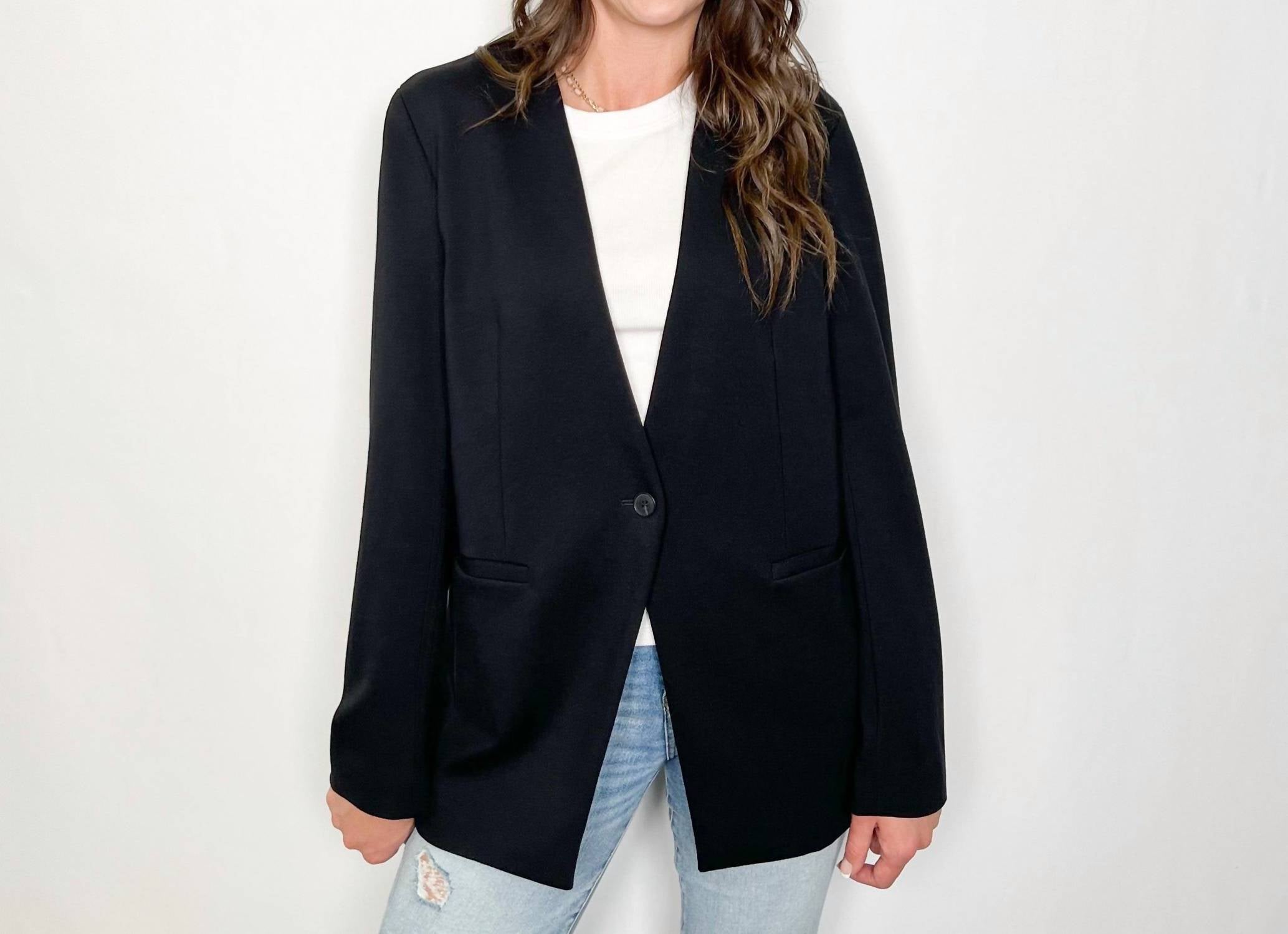 Tailored to perfection, this blazer will be your go-to jacket for years to come. Meet "The Perfect Blazer" by Spanx, an elevated classic in a sophisticated Classic Black hue with long sleeves and a collar neckline. This women's blazer is crafted from a smoothing premium ponte fabric with a composition of 68% Rayon, 28% Nylon, and 4% Elastane, featuring 4-way stretch that promises comfort and style. It includes functional pockets and a convenient button closure for a polished finish. Enjoy the ease of care with machine wash cold, inside out, and line dry, making it a no-fuss staple for your wardrobe.