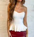 Introducing the Falling Leaves Top by Adeline, an elegant strapless piece in white. Crafted from a luxurious blend of 50% Rayon, 48% Nylon, and 2% Cashmere, this textured blouse is both comfortable and stylish. The pull-on design is accentuated by a sweetheart neckline and a flattering peplum hem, perfect for standout solo styling or layered looks. Care for this garment by hand washing in cold water and line drying. Model in white is 5’7”, with measurements 34” bust, 25” waist, and 35” hips, wearing size small.