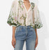 Introducing the Charis Blouse by alice + olivia in Ivy Romance, an exquisite piece crafted from a luxurious cotton blend with a romantic floral ivy print. Featuring long bishop sleeves and a collared neckline, this blouse delivers effortless elegance. Composition: 70% Cotton, 30% Silk. Closure: Button closure. Care: Dry clean only. Its imported design and 24-inch length make it a sophisticated addition to any wardrobe, fit for both daytime denim and special occasions. Model is 5'10" and wearing a size XS.