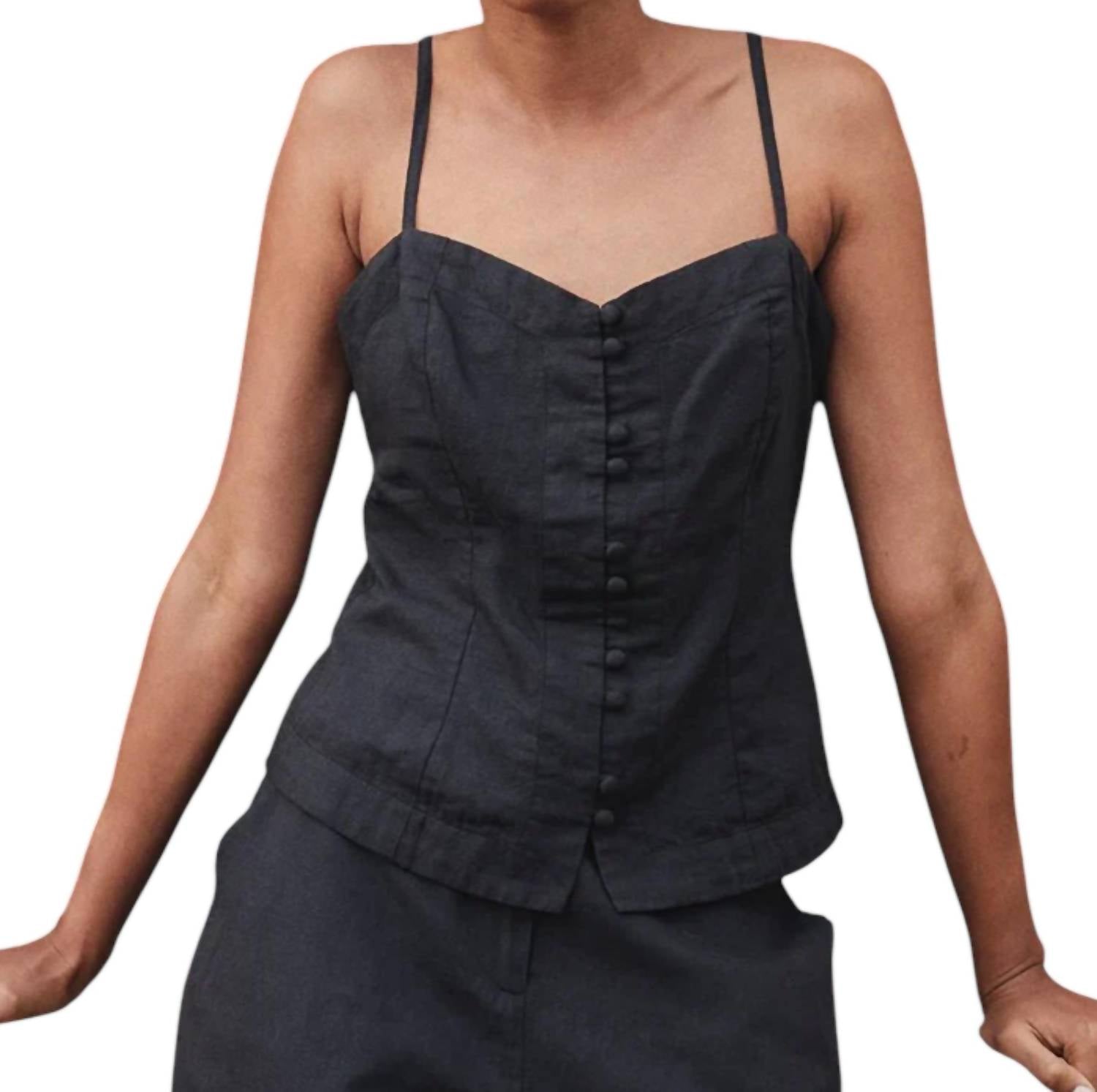 Introducing the Cortez Button Down Top by CIAO LUCIA, a minimalist piece perfect for your evening events. This black blouse features a cotton-linen blend and highlights a flattering sweetheart neckline with adjustable spaghetti straps. Its button closure adds a touch of elegance, making it ideal for spring occasions. For best results, please ensure it is dry cleaned.
