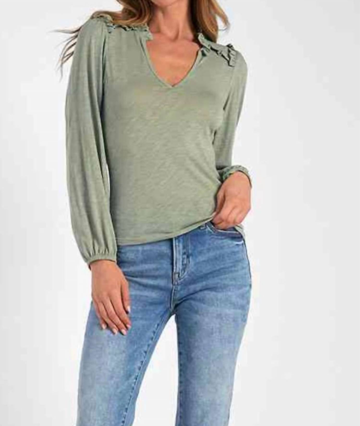 Experience effortless style with the Long Sleeve V-neck Top With Ruffle Detail by ELAN, a chic addition to your summer wardrobe. Designed in a soothing sage color, this solid top features a flattering V-neckline complemented by elegant ruffle detailing. The pull-on closure enhances convenience and comfort. Perfect for minimalist, vacation-ready looks, this versatile piece stands out in the women's blouse category.