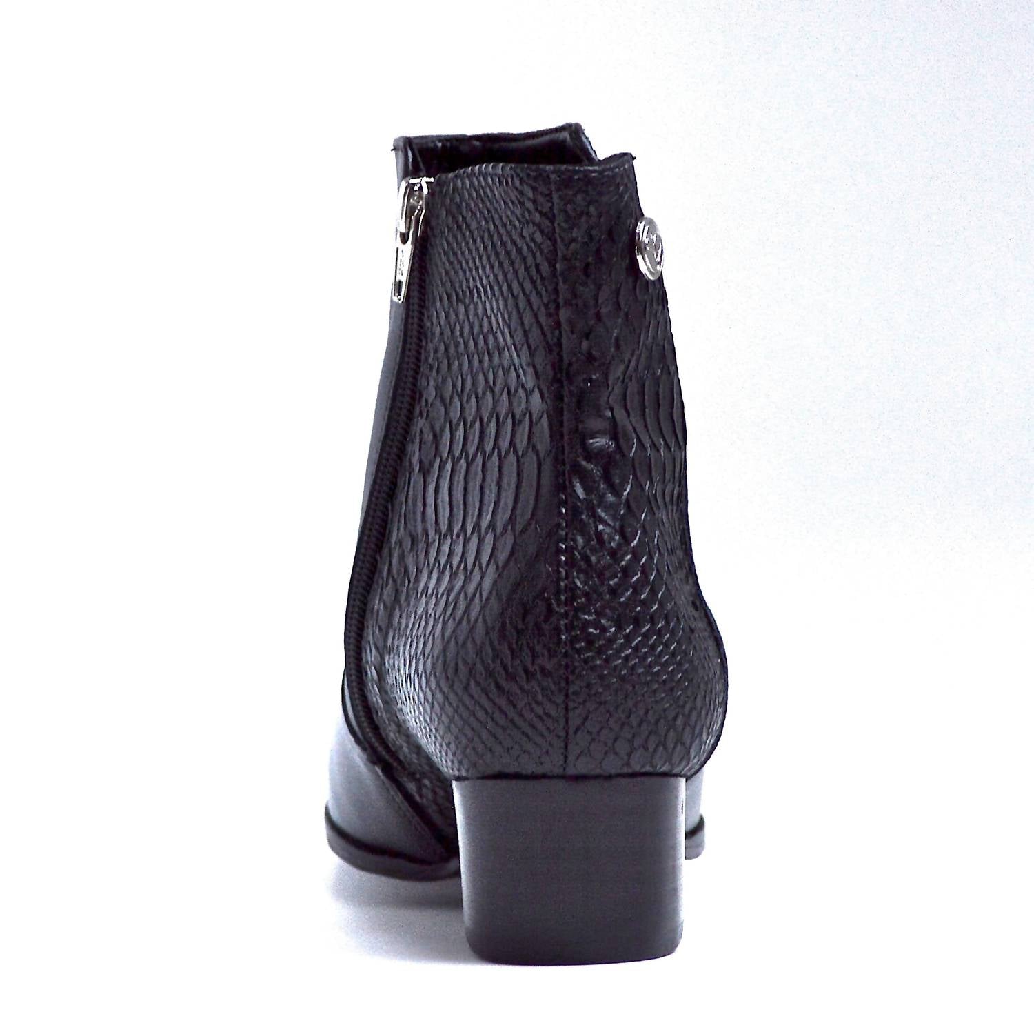 Say hello to the perfect, most versatile boot. The ankle height makes this style easily transition from day to night. Wear them with your favorite skinny jeans and tee for a more laid back look, or pair them with your favorite mini dress and jacket for a night out on the town. Introducing the AMUSE Ankle Boot by Chelsea Jones, crafted in sleek black leather for a quietly luxurious look. This boot features an almond toe design, a 1.5" block heel, and a cushioned insole, ensuring both style and comfort. Made in Brazil, the two-textured leather upper is paired with a flexible rubber sole for a more comfortable wear. Perfect for dinner parties or a stylish night out.