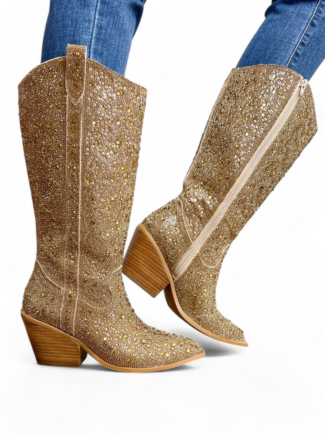 A stylish boot with a comfortable fit and the perfect amount of height. These classic boots are the perfect addition to any outfit and can be worn season after season. Elevate your style with the Women's Glitzy Rhinestone Boots by Corkys Footwear, a dazzling addition to your wardrobe. These Western-style boots in gold feature eye-catching rhinestone embellishments and a pointed toe for a chic, bold look. Designed with a convenient side zip for easy wear and pull-on loops for added comfort. Proudly made in the US, they showcase a medium width and block heel to ensure comfort throughout the day.