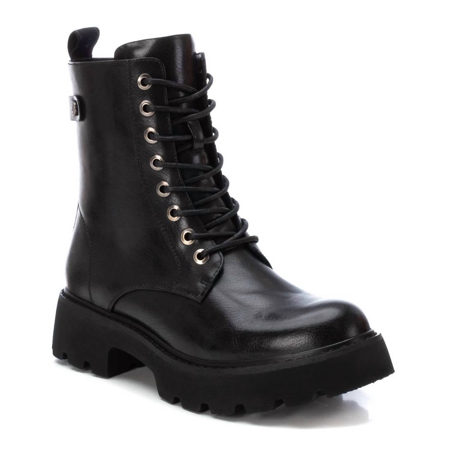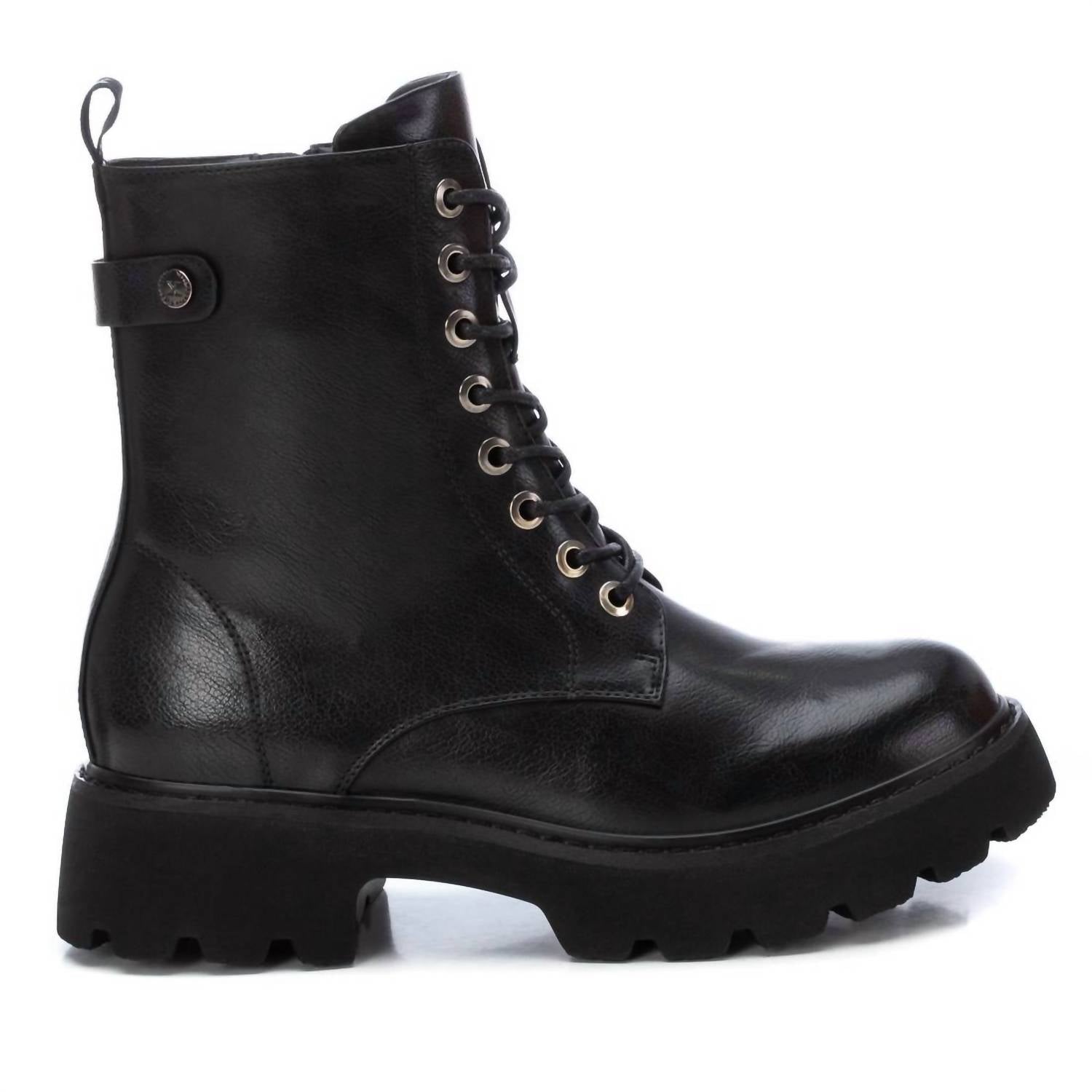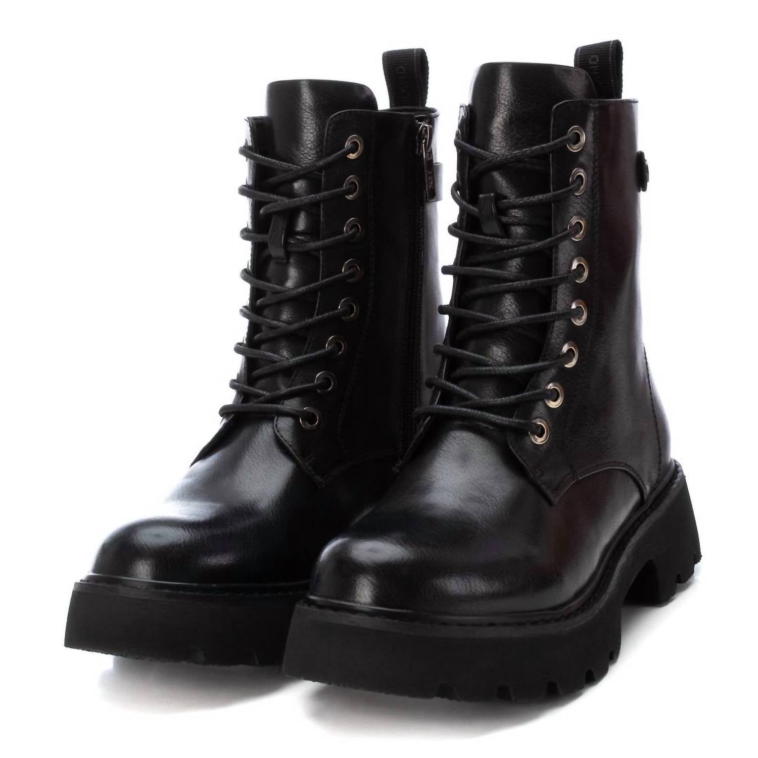 Elevate your wardrobe with the Women's Combat Booties by Xti, featuring a chic blend of style and comfort. Crafted from breathable faux leather, these black booties are designed with a round toe and a 1.57-inch block heel for a trendy edge. They offer effortless wear with a side zipper and lace-up closure, ensuring a perfect fit and non-slip rubber sole for stability. Ideal for daily wear, these booties boast padded insoles and lightweight construction for all-day comfort.