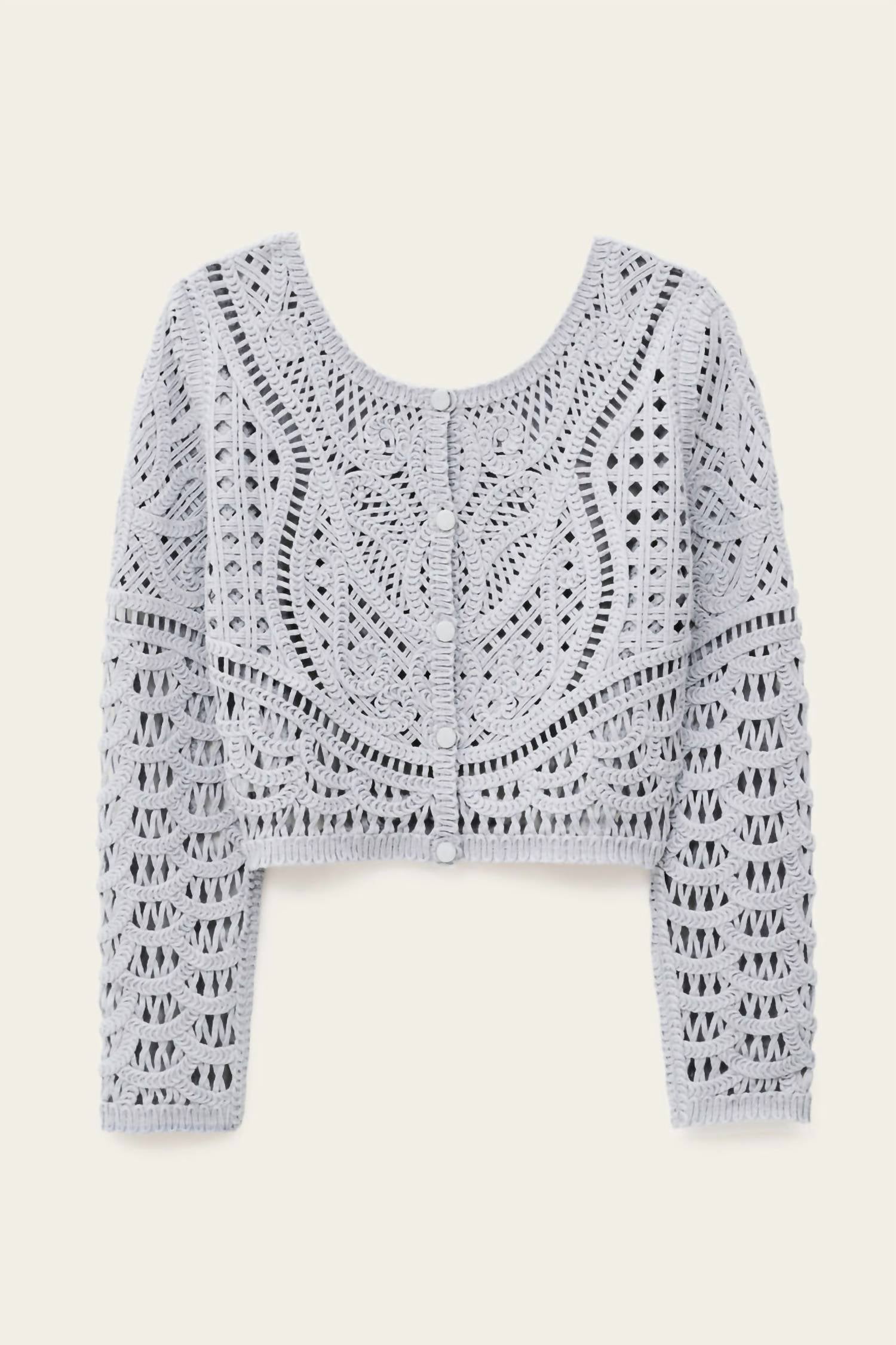 This cardigan will be a sweater-rotation favorite. Introducing the Marc Cardigan by ba&sh, a chic addition to your wardrobe with its stylish design and textured pattern. Crafted from 100% cotton and featuring long sleeves, this cardigan boasts a unique openwork texture and ribbed trim. Its cropped cut is complemented by the back button fastening, adding a modern twist to any outfit. Available in a soft Ciel hue, this piece requires dry cleaning to maintain its elegant appearance.