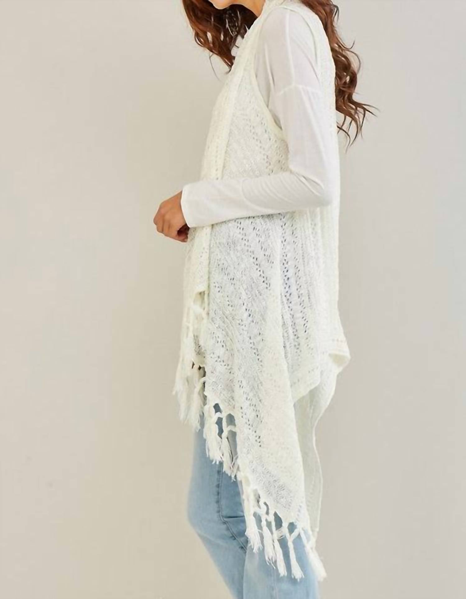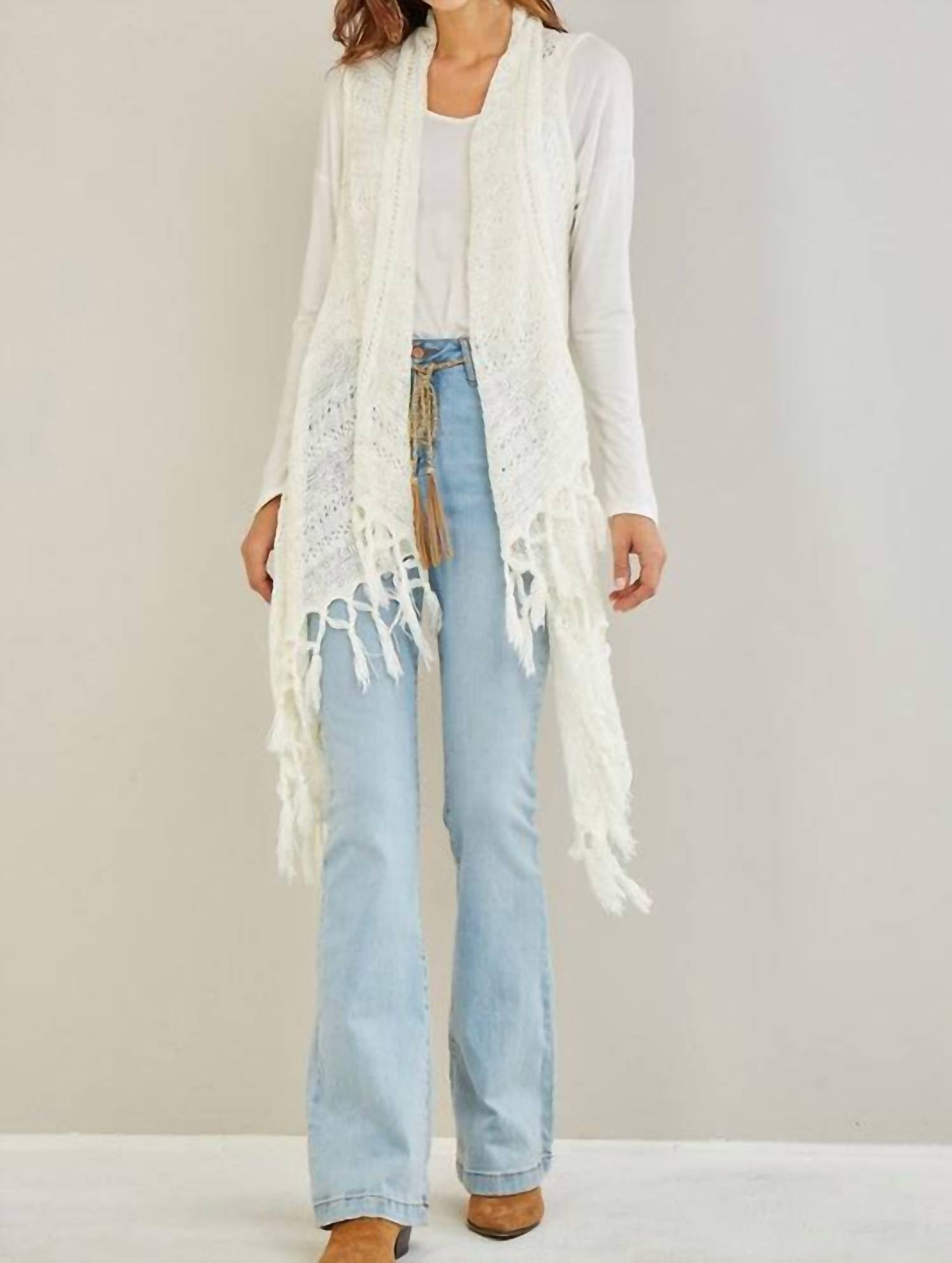 A classic fit that works just as good buttoned as it does left open. Elevate your layered ensemble with the Crochet Fringed Light Cardigan by Entro, featuring boho charm in a textured beige design. This sleeveless piece offers a stylish pull-on closure and a classic crewneck, making it perfect for easy wear. Perfect for women seeking an effortlessly chic look, its fringe detailing adds a playful touch. Pair it with various outfits for a versatile addition to your wardrobe.