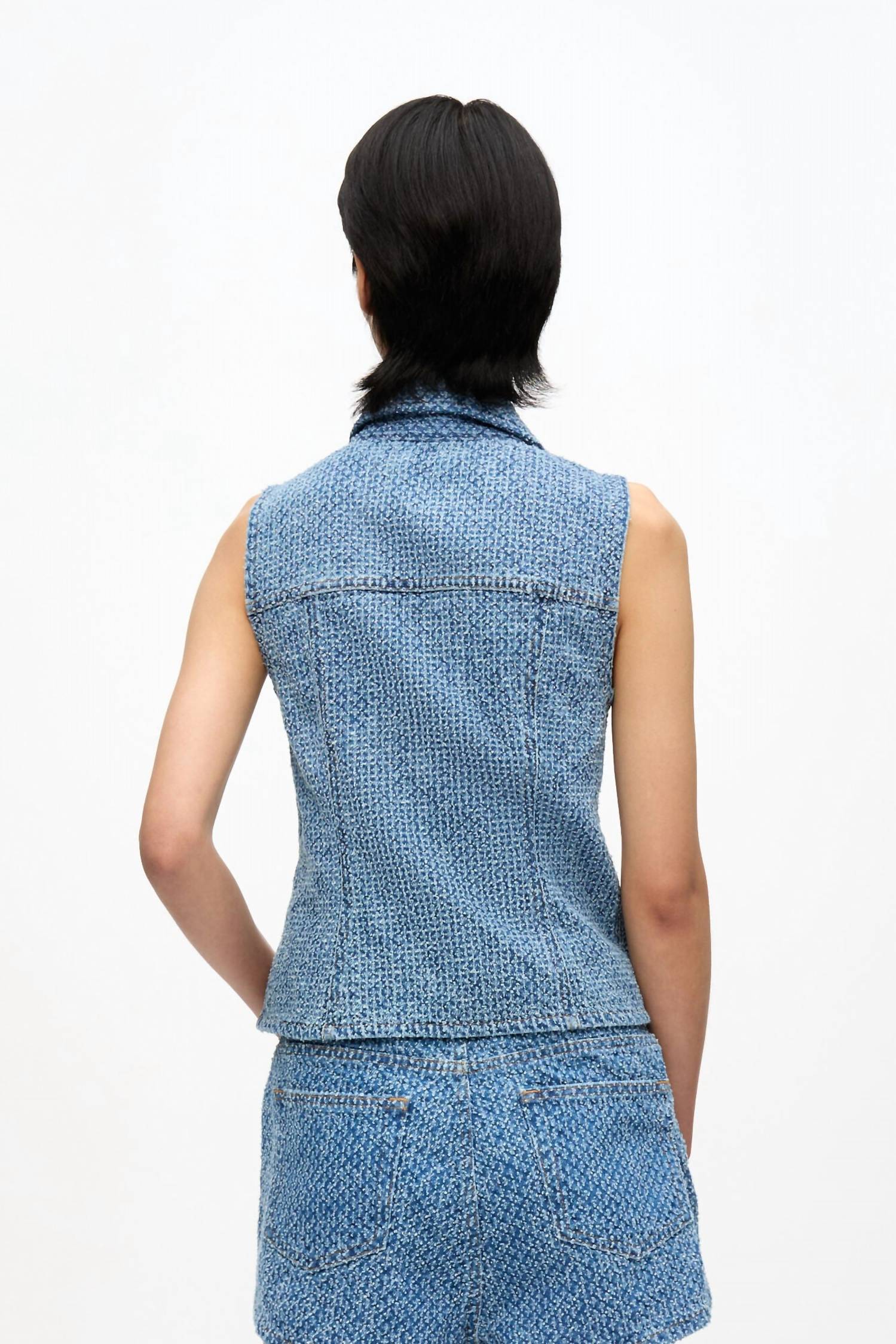 That extra layering piece you didn't know you needed! Introducing the GANNI Fluffy Denim Fitted Top in a stylish mid-blue stone shade, perfect for adding a touch of texture to your summer wardrobe. This sleeveless vest features a classic collar and convenient button closure, complemented by two chest pockets for practical yet chic vacation style. Crafted from denim with a textured pattern, this women's top is a standout piece for maximalist trends. For care, simply machine wash and tumble dry.
