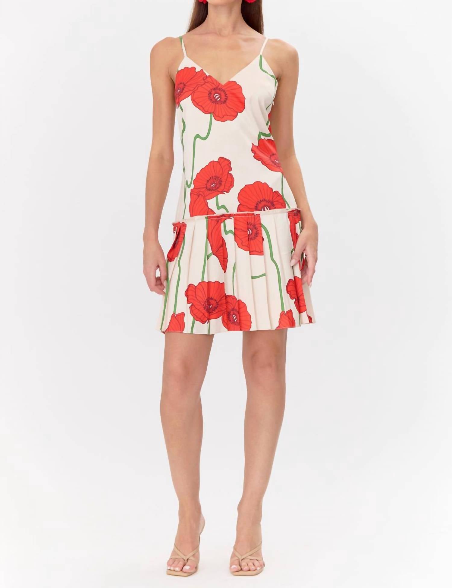 Introducing the Camila Rose Print Pleated Mini Dress by Adelyn Rae, a staple for your summer wardrobe. This mini dress features delicate spaghetti straps and a flattering V-neckline, crafted from polyester. Adorned in a vibrant cream and red floral pattern, it boasts a playful drop-waist pleated skirt with a tie closure for added charm. Care for this boho chic piece by hand washing and laying it flat to dry. Ideal for vacation outings, this romantic, shift silhouette dress is designed for women who love effortless style.