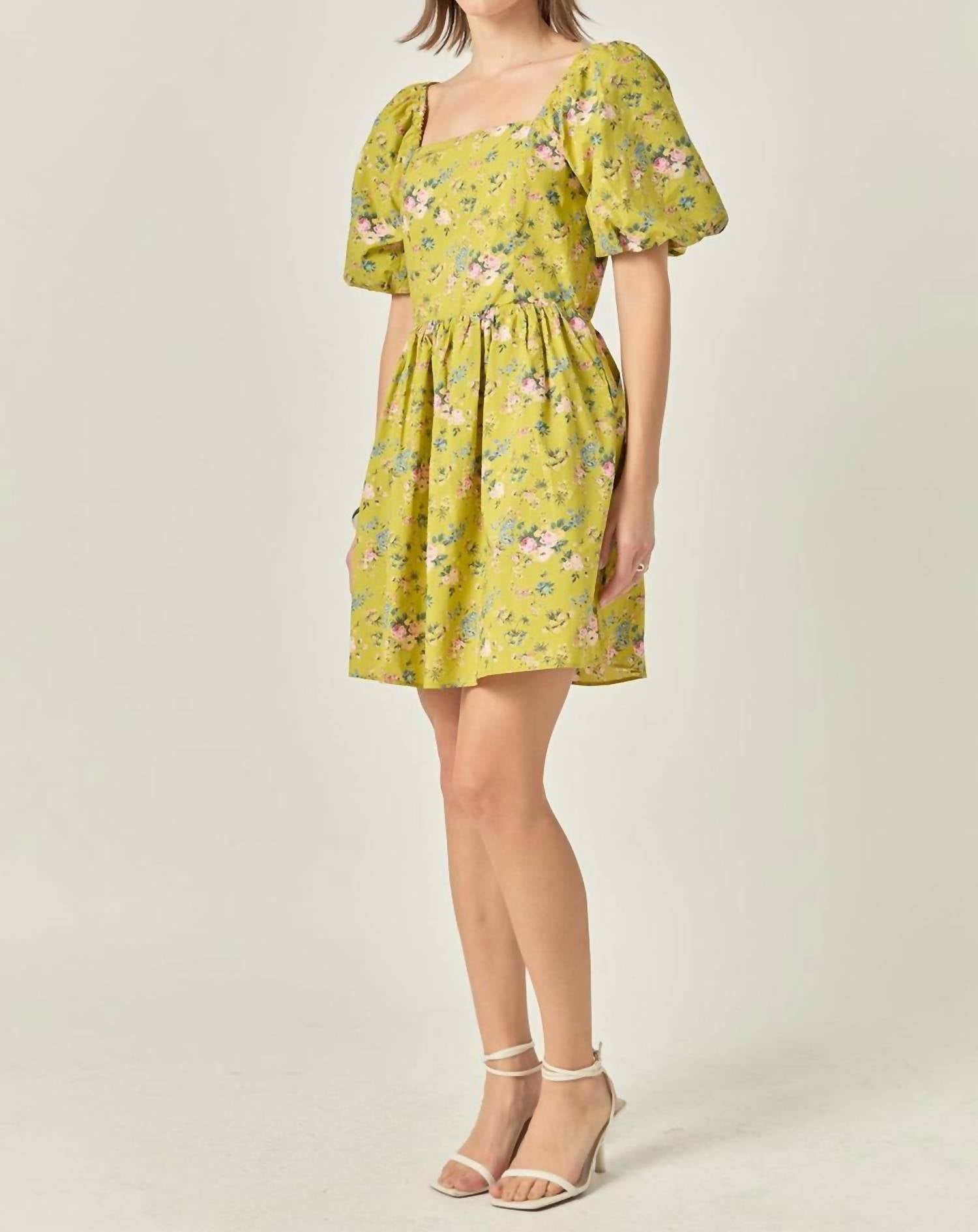 The kind of easy and flattering dress you'll be reaching for all season long. Embrace the spirit of summer with the Floral Back Cutout Dress by English Factory in a refreshing celery color. This women's mini dress features short blouson sleeves and a stylish square neckline, finished with a charming back cutout detail with tie closure. The floral pattern and side seam pocket add functional beauty, while the shell is crafted from 100% Polyester with a comfortable lining of 80% Polyester and 20% Cotton. Care for this delightful dress with hand washing to maintain its airy silhouette.