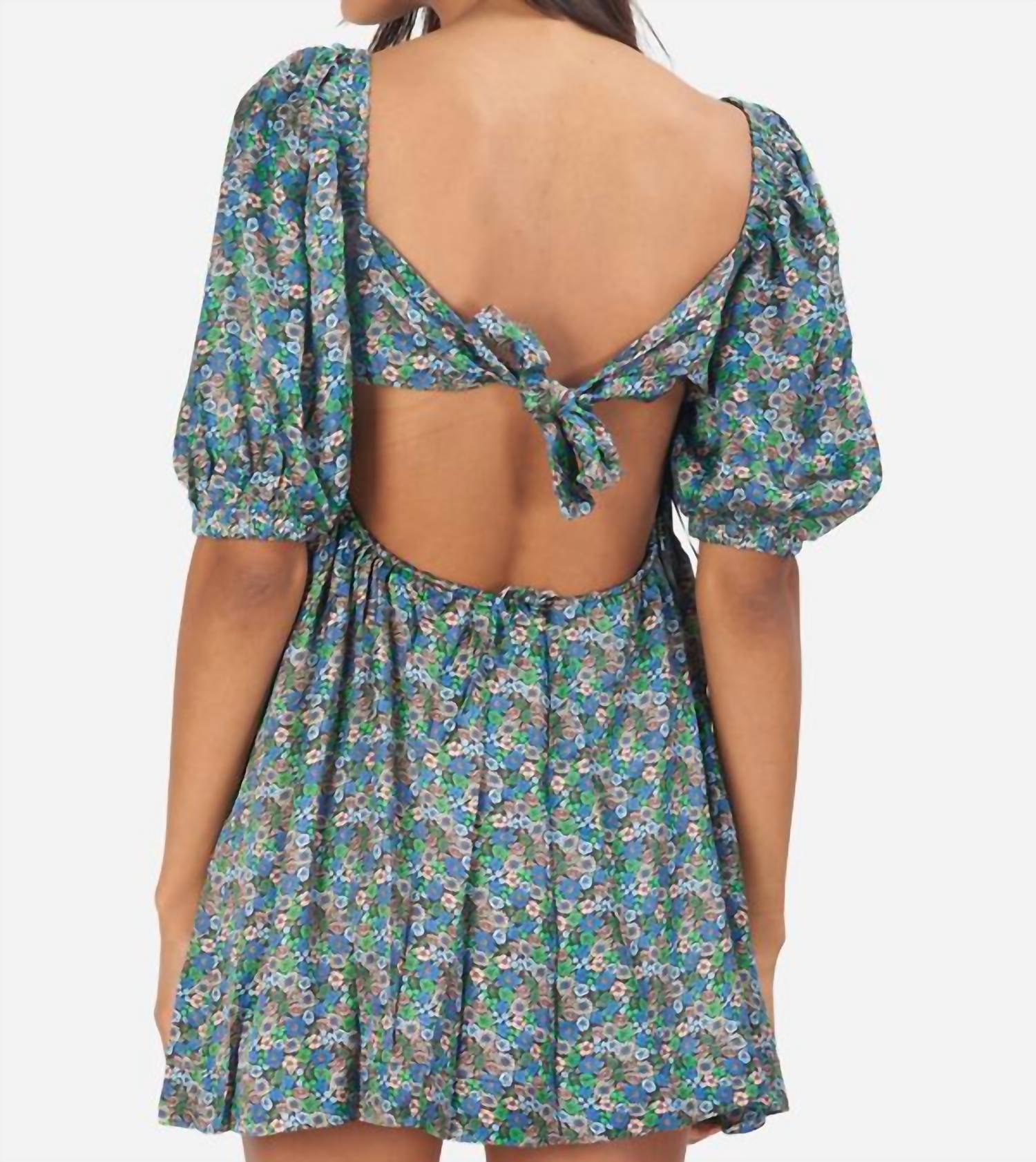 A short and breezy dress for those warmer days. Meet the Alisa Mini Dress by For Love & Lemons, an eye-catching piece in a patterned green perfect for any holiday party. This mini dress features short puff sleeves with elastic cuffs and an elastic sweetheart neckline, complemented by unpadded underwire cups with a front tie accent. The luxurious blend of 56% Ecovera, 44% viscose is accompanied by a partially lined interior of 98% recycled poly and 2% spandex. Its open back with a tie closure adds a daring finish to this New Year's Eve ready shift, with a recommended fit true to size. Care: Dry clean only.