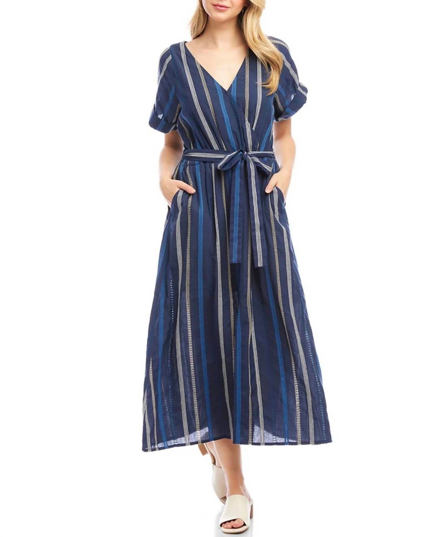 Just add slides or mules and you are good to go. Item #20601947 From Karen Kane, this dress features: Embroidered cotton fabrication Faux wrap silhouette Surplice v-neckline Cuffed short sleeves 2 functional side pockets Removable waist tie Elastic waistband Front center slit Lined Front snap closure at the chest Approx. 50.75" length Cotton Machine wash cold/line dry Imported.