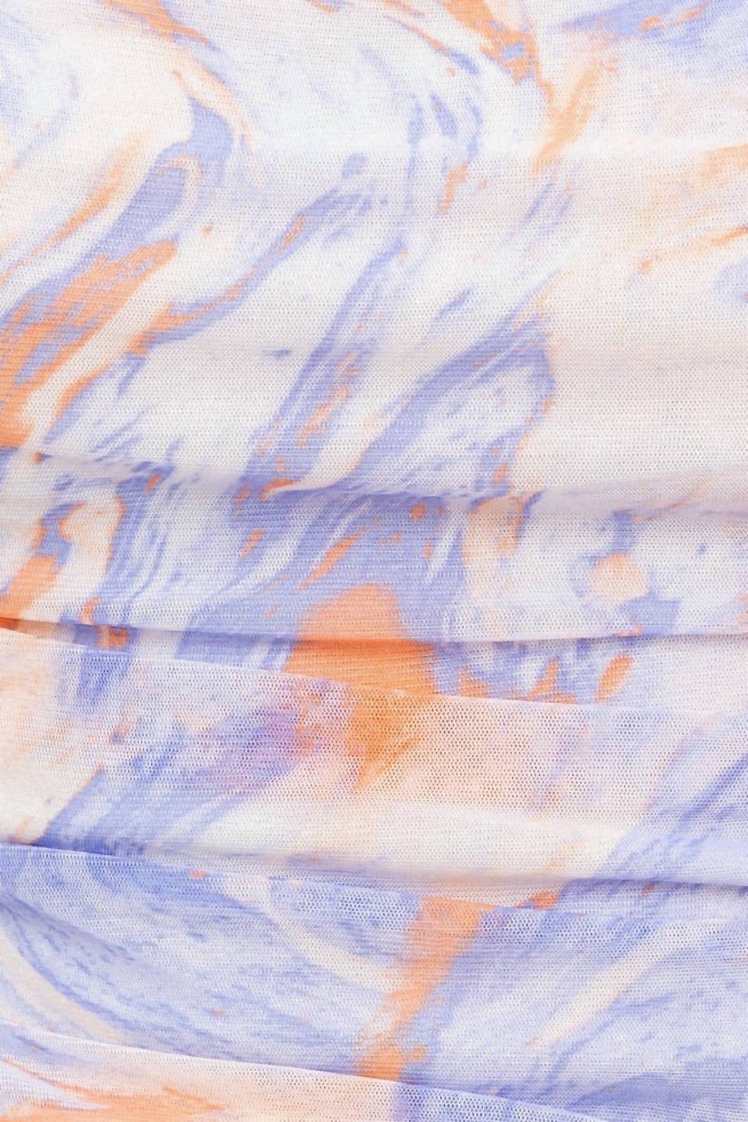 A short and breezy dress for those warmer days. Elevate your evening look with the Ruched Bodycon Mini Dress by LE LIS, a perfect choice for a dinner party or Valentine's Day celebration. This mini dress features spaghetti straps and a stunning ruched mesh fabric that creates a luxe silhouette in an eye-catching multi-color pattern. Made in the United States, it includes a convenient zip closure. The model, wearing a size small, stands at 5'8" with measurements of 32A bust, 24" waist, and 34" hips.