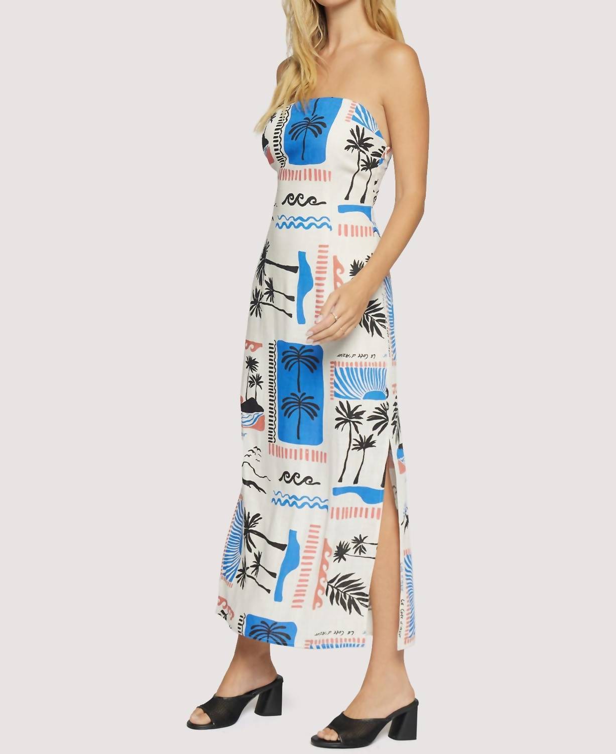 Style this maxi with your favorite statement necklace and sandals for the perfect look. Introducing the Azure Paradiso Strapless Maxi Dress by LOST + WANDER, the ultimate choice for making a stylish statement. This strapless maxi dress features side slits for added allure and a body-skimming silhouette that flatters effortlessly. It's crafted from 100% Polyester and has a convenient zipper closure. Care instructions: Hand wash cold for longevity. Model wears size S and stands 5'10".