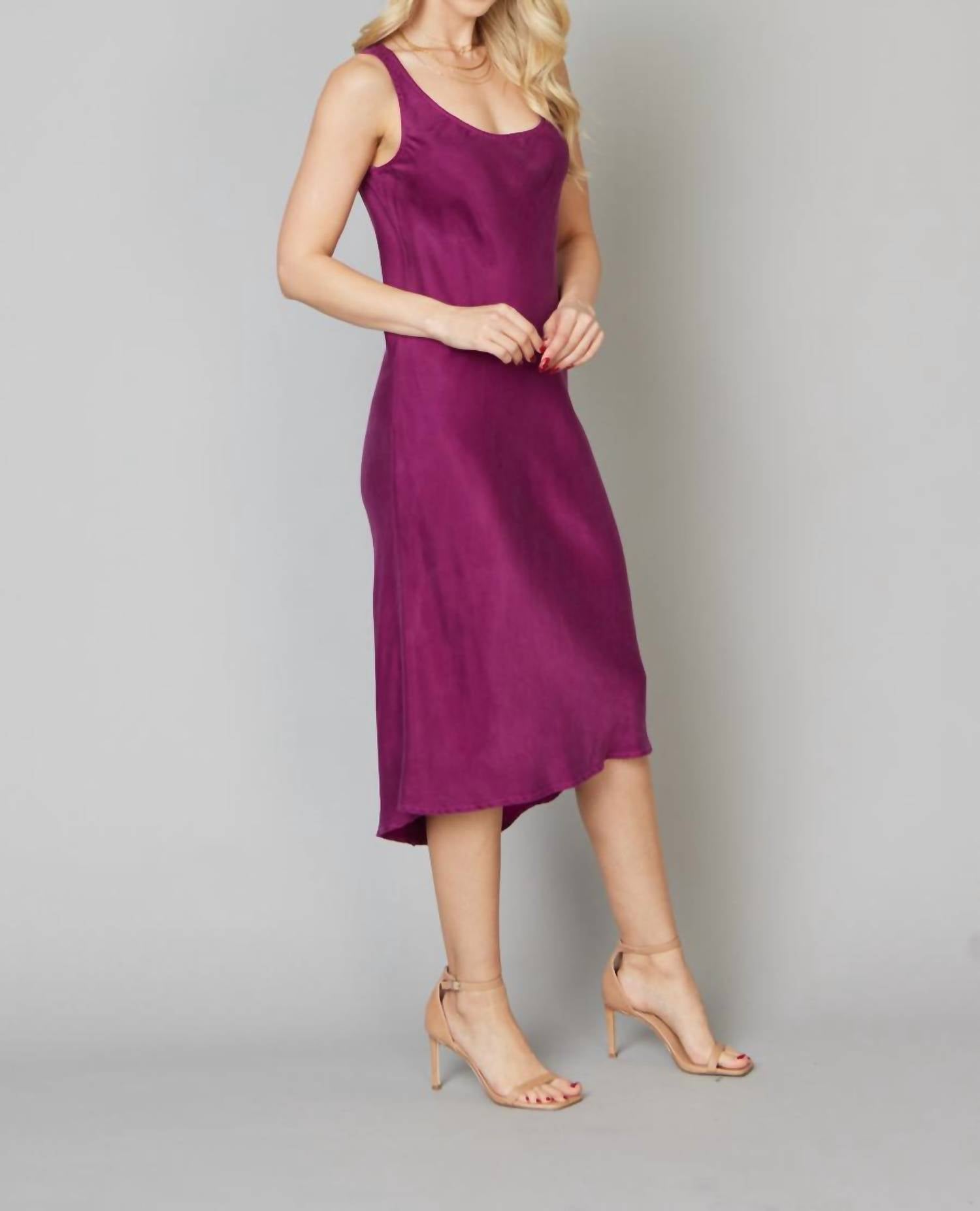 Just add slides or mules and you are good to go. Elevate your holiday party wardrobe with the A Line Tank Dress from Maven West, a minimalist yet chic choice in a rich Berry Plum. This sleeveless slip silhouette offers effortless elegance with its scoop neckline and solid pattern. Made in the USA, it features a convenient pull-on closure for ease of wear. A perfect addition for spring occasions, this midi dress is designed without pockets, keeping your look sleek and streamlined. 100% Cupro.