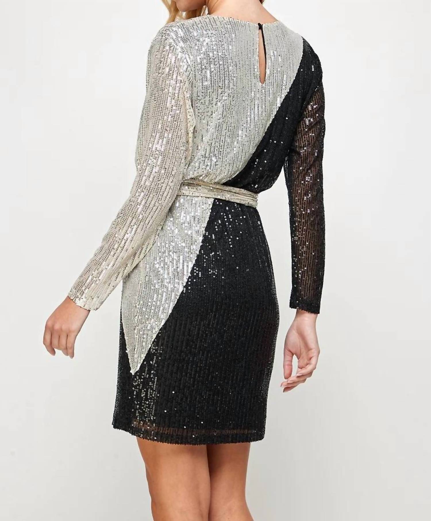 The kind of easy and flattering dress you'll be reaching for all season long. The Sequin Color Blocked Long Sleeve Dress by SEE AND BE SEEN is an essential addition to your collection for special occasions. Crafted with an asymmetrical design, this stunning black and silver mini dress features a sequin sash and comfortable long sleeves. Garment length is 36 inches, offering a flattering sheath silhouette with a keyhole back closure for added charm. Perfect for the holidays, this piece is a true standout with its textured detail and vibrant color block pattern. Model is 5'10" and wears a size S with a bust of 18 inches.