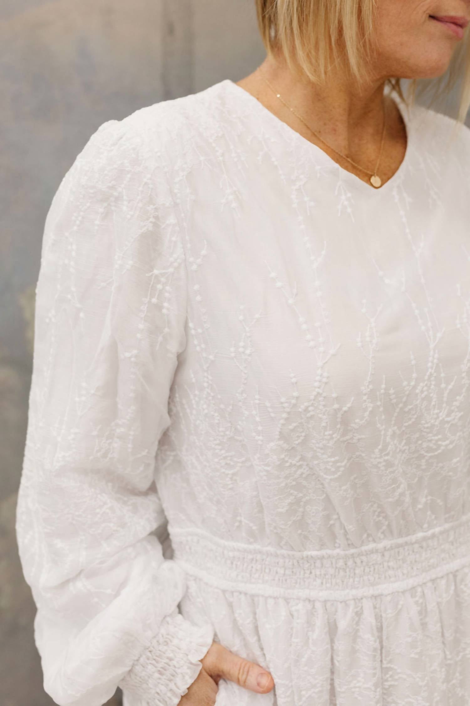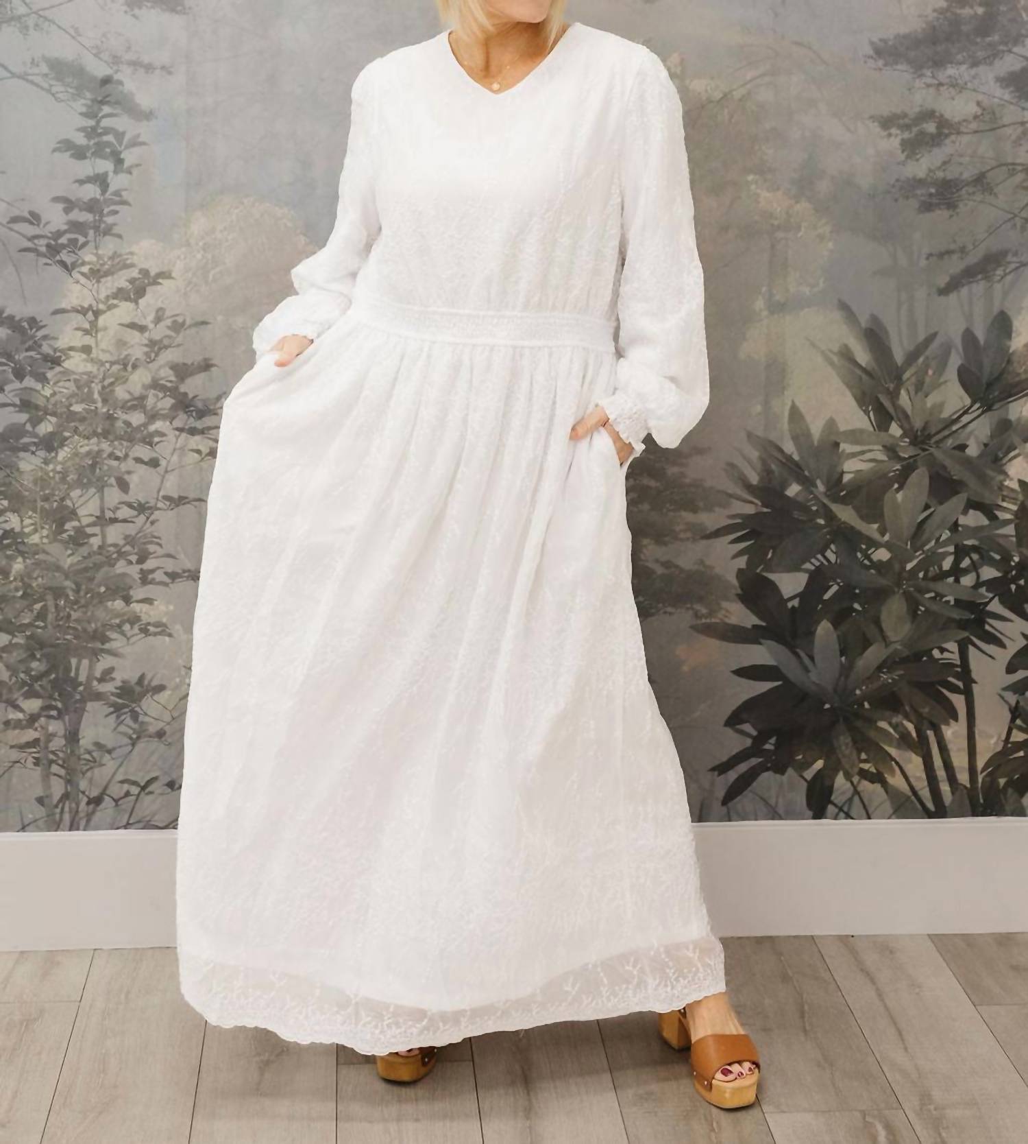 Who doesn't love a good maxi dress? This one you'll be reaching for season after season. Introducing the Embroidered Maxi Dress by Tea N Rose, a perfect choice for a sophisticated spring look. Made from 100% polyester, this long sleeve dress in crisp white features delicate embroidery on sheer fabric over a full lining. The design includes a flattering smocked waist, V-neckline, and functional pockets, complete with button closure for easy wear. To maintain its elegance, hand wash cold, lay flat to dry, and opt for low iron if needed. The dress fits true to size with a maxi length and an A-line silhouette, designed for a minimalist Easter occasion.