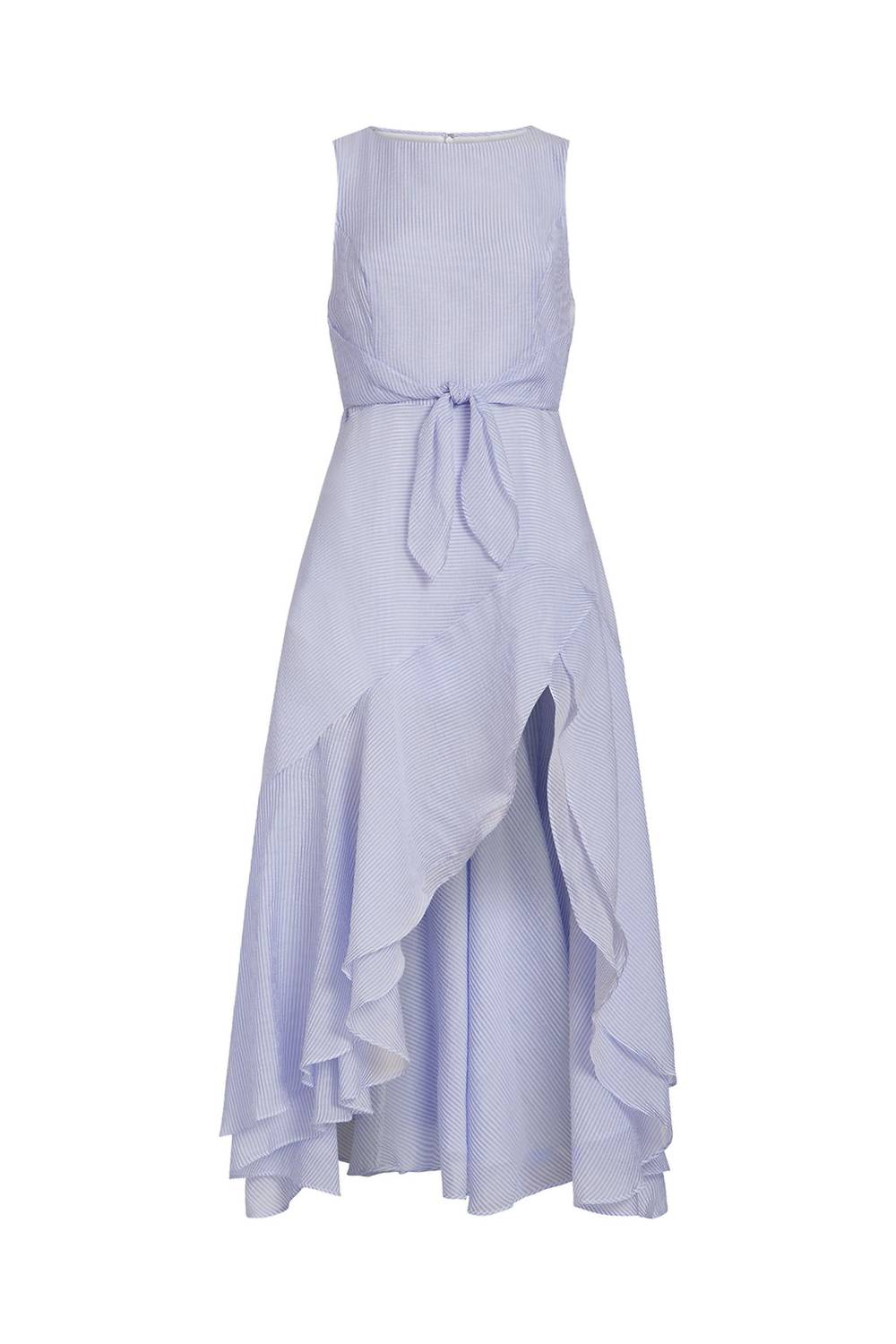 Introducing the Casella Maxi Dress by Amanda Uprichard, a stunning sleeveless piece that embodies elegance with its timeless stripe pattern. Crafted from a luxurious blend of 65% Rayon and 35% Nylon with a 100% Polyester lining, this dress features a graceful hi-low ruffle skirt and a striking boat neckline. The A-line silhouette is enhanced with princess seams and a self-tie waist, offering a flattering fit. Originating from a blend of design inspirations, it offers a zip closure at the center back and requires dry cleaning to maintain its pristine condition. Perfect for weddings and spring celebrations.