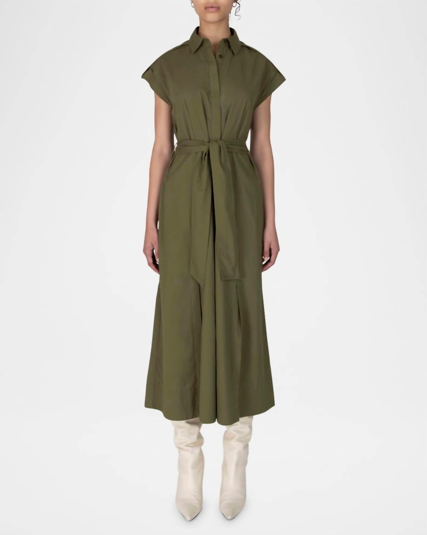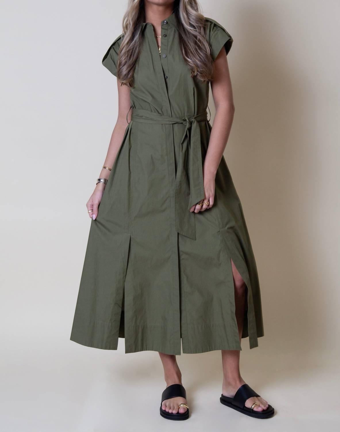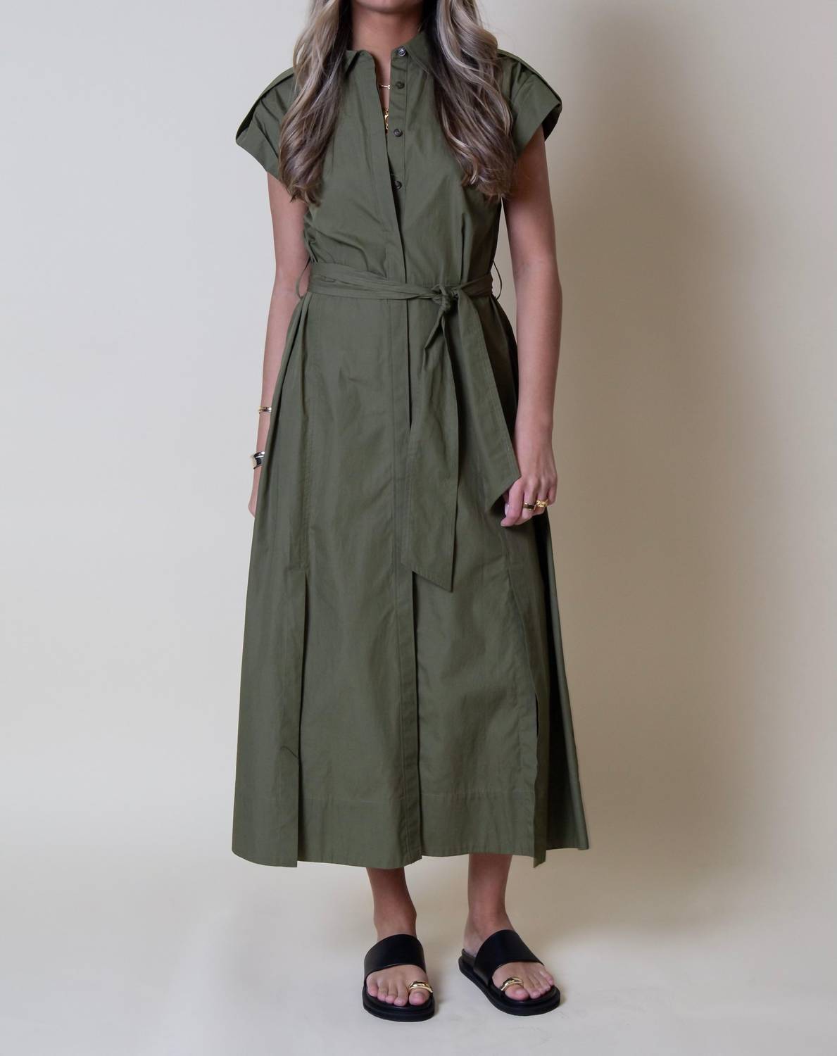 Just add slides or mules and you are good to go. The Haley Shirt Dress by Derek Lam 10 Crosby is a quintessential fall piece in a striking hunter shade, perfect for minimalist style enthusiasts. It features short sleeves and an A-line silhouette with a collar neckline, complemented by epaulets and an extended shoulder with a cuff for a structured look. The dress includes a stylish self-tie belt and button closure, with slits for added flair. Care for this elegant dress requires dry cleaning.