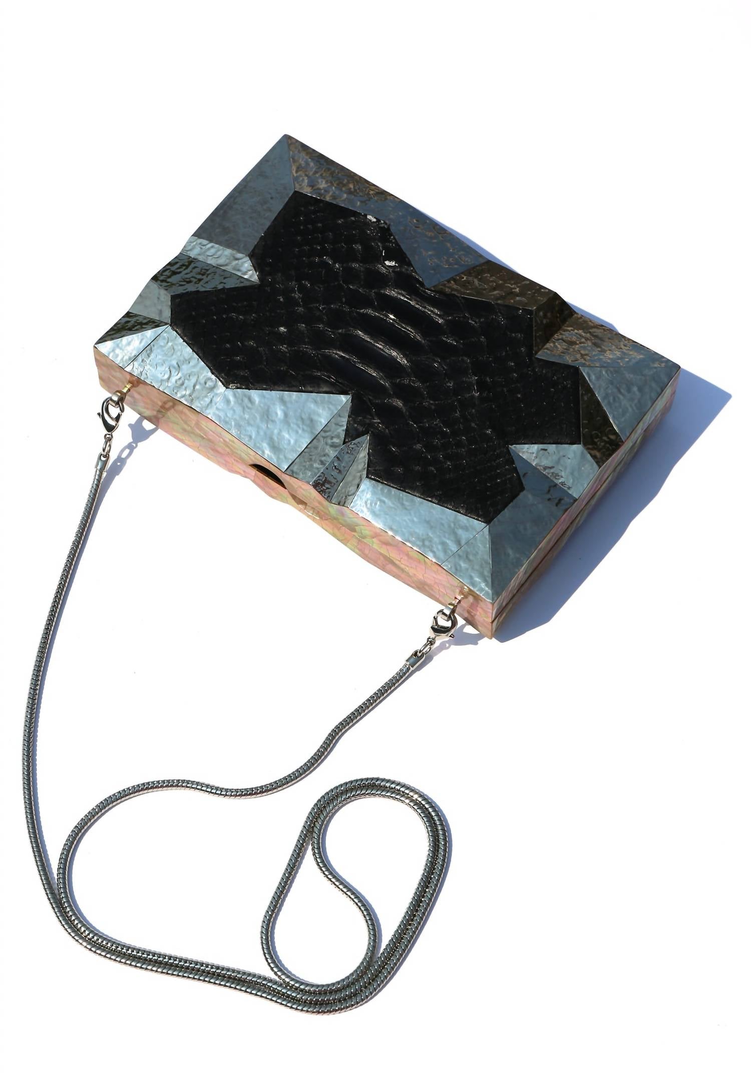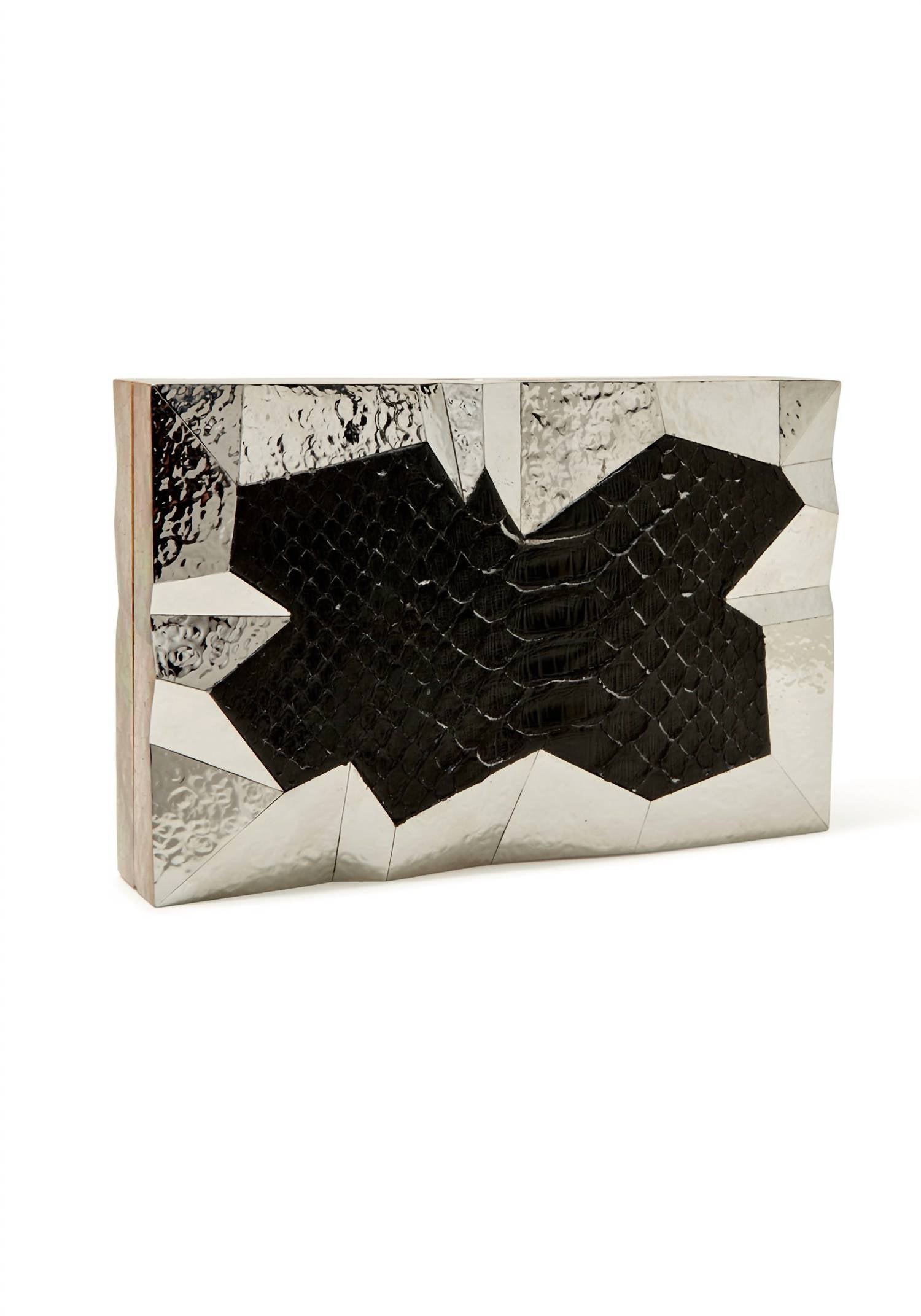 Don't be mistaken by its size, this little bag holds more than you'd expect! The Women's Abrolhos Clutch Bag by Emm Kuo is a striking accessory featuring a blend of materials like black python, hammered stainless steel, and mother of pearl siding. The design offers multidimensional allure with its lustrous silver and black color scheme. The clutch includes a detachable strap for versatile styling, coming in a compact size of 200mm x 110mm x 42mm. This piece lacks specific country of origin details.