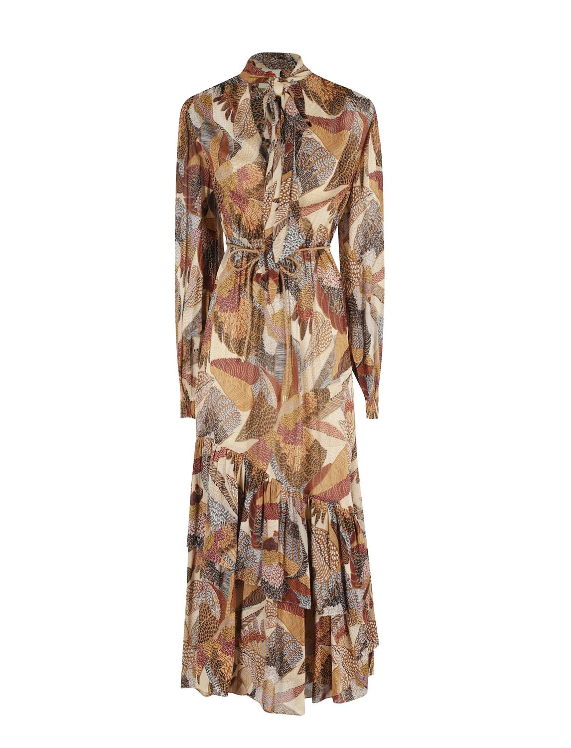 A maxi dress that is just as cute as it is comfortable. Embrace vibrant style with the FARM RIO Long Sleeves Maxi Dress in Dotted Macaws Cream, perfect for vacation or any maximalist occasion. This maxi dress features long sleeves, an A-line silhouette, and a V-neck, crafted from 100% viscose with a deliciously soft 100% modal lining. Closure: Back zip closure, ensuring a seamless fit. Care: Dry clean only.