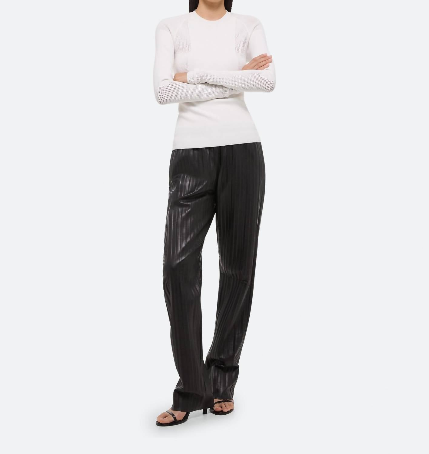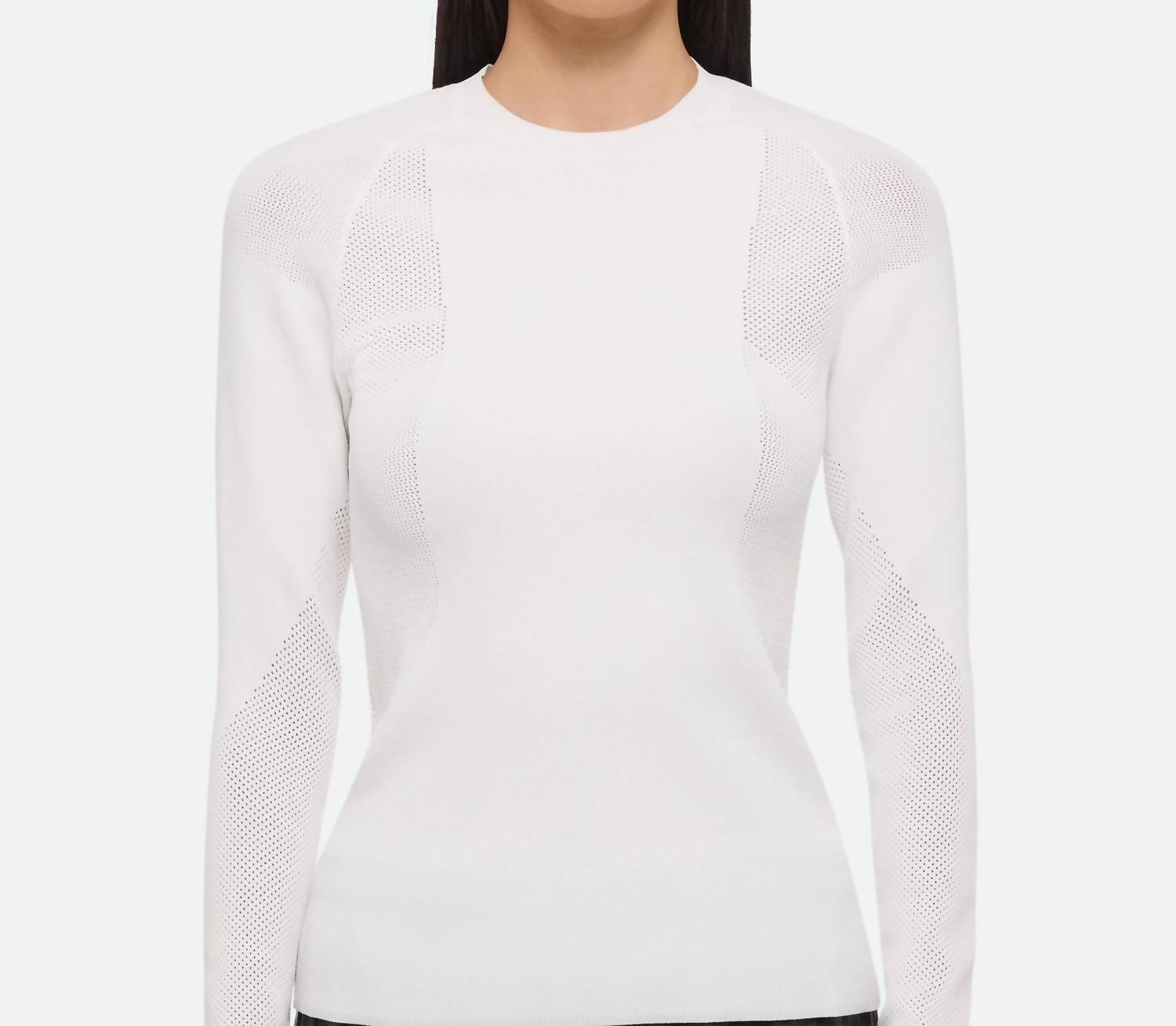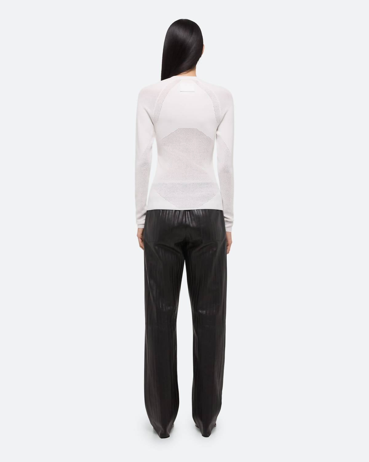 Experience the perfect blend of comfort and style with this trendy crew neck sweater, designed to effortlessly elevate your wardrobe. Pair it with your favorite denim and loafers for the perfect look. Elevate your wardrobe with the HELMUT LANG Sport Top in a sleek black, crafted from a soft recycled viscose blend for ultimate comfort. This women’s crewneck sweater features long sleeves, cushioned mesh panels, and a smooth finish with ribbed hem and cuffs, ensuring a flattering fit with its integrally knit design. Composition includes 73% Viscose, 15% Polyester, 10% Polyamide, and 2% Spandex. Designed with a pull-on closure and adorned with a leather logo patch at the back, care requires a solvent dry clean (excludes trichloroethylene). Model is 5’10” and wears size S.