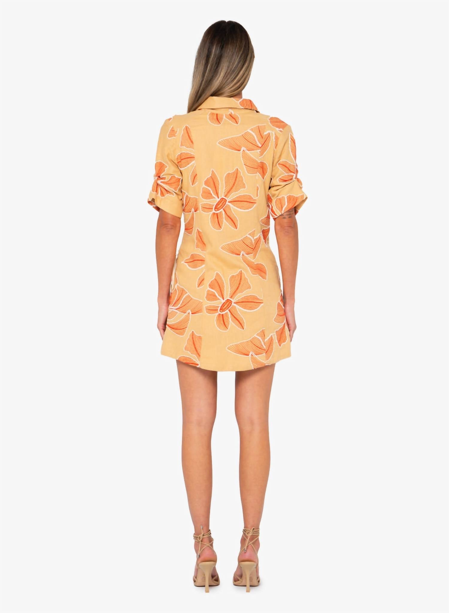 A short and breezy dress for those warmer days. Introducing the Ginger Dress by JBQ, a chic orange multi mini dress crafted for style and comfort. This dress features a collared, button-down silhouette with a V-neckline and short sleeves accented with gathered detail. Made in the USA, it blends 80% viscose and 20% linen for a lightweight feel. Closure: Concealed button. Care: Wash cold.