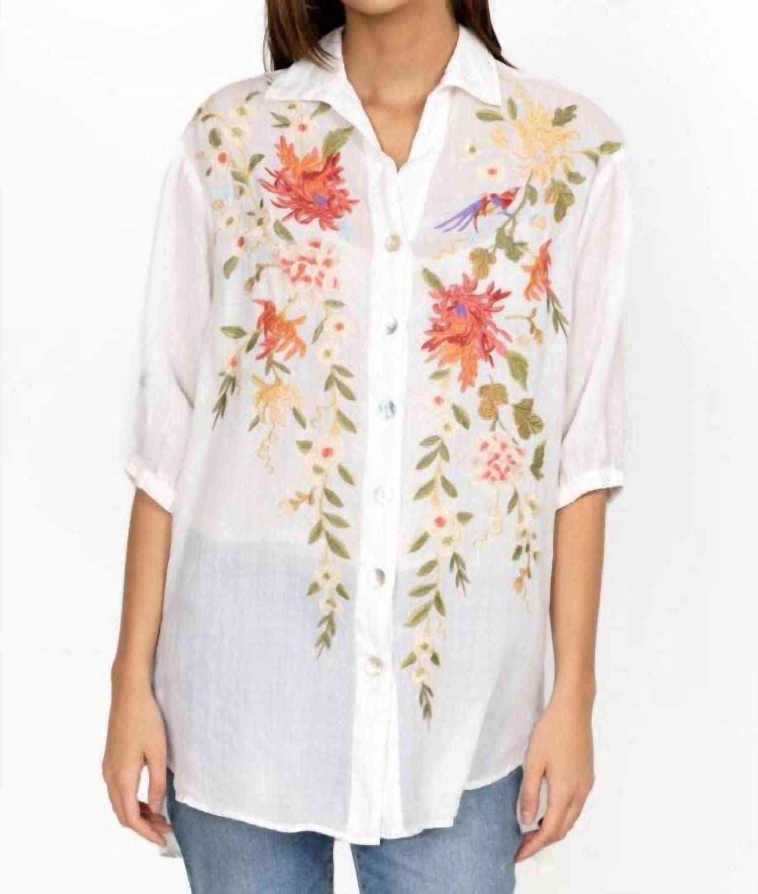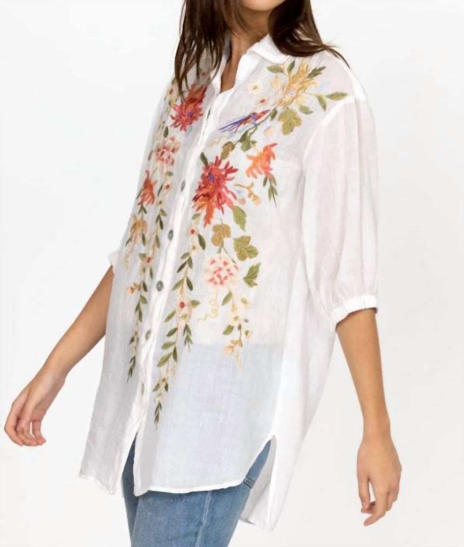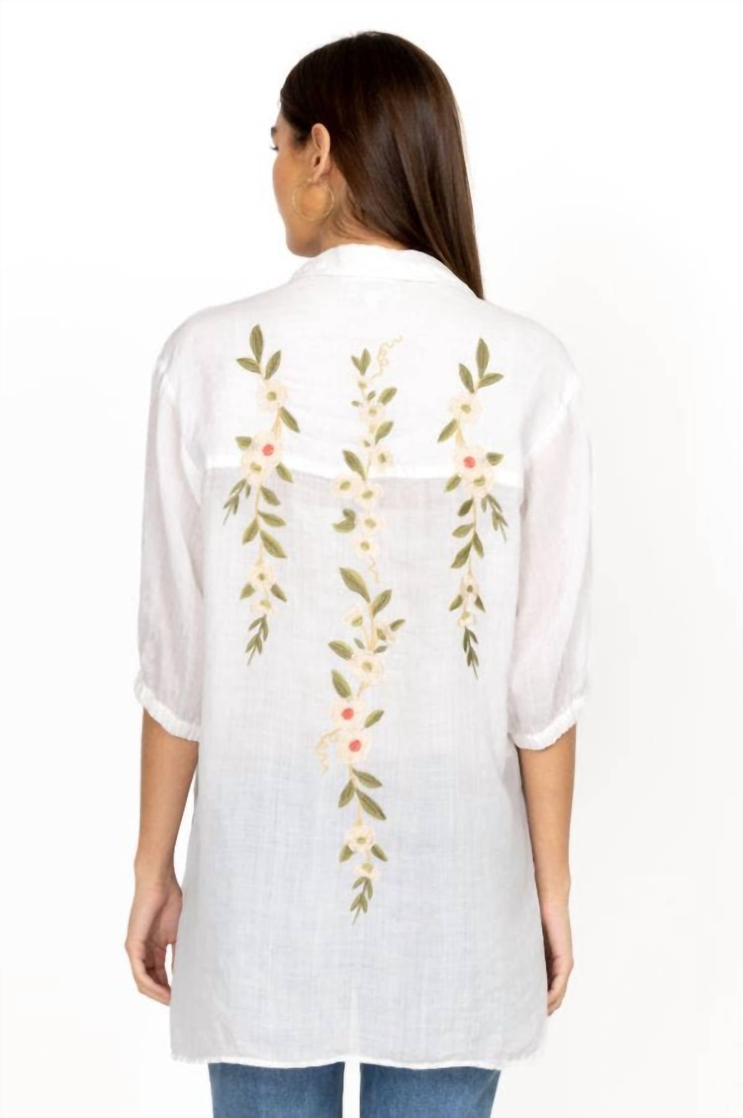 Embrace the versatility of this tunic-style blouse, expertly crafted for seamless layering or perfect to wear on its own. Its detailed design and comfortable fit make it a perfect addition to any closet.Oversized silhouette with a collar, three-quarter length sleeves, and a front button closure. Finished with a colorful flower-dotted placement embroidery. 100% Ramie. Placement Embroidery. Elastic Sleeve Cuffs. Shell Buttons. Model Height: 5'11". Model is wearing a size Small. Measurements for Size Medium: Length- 33", Bust- 48 1/2". Care instructions: Machine wash cold only. Non chlorine bleach when needed. Tumble dry low. Warm iron. SKU W25723-2:WHITE.