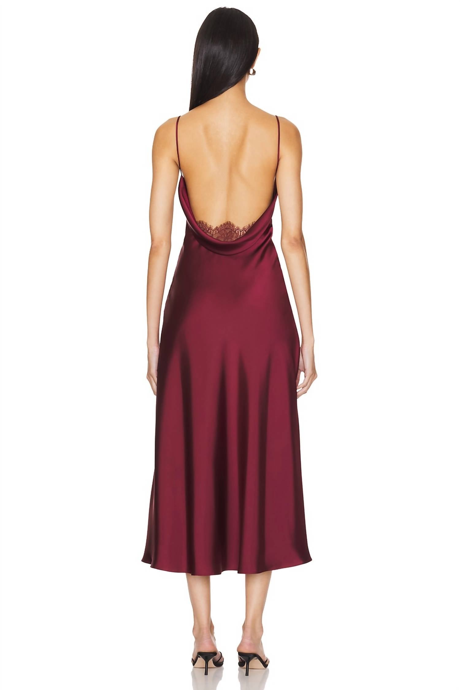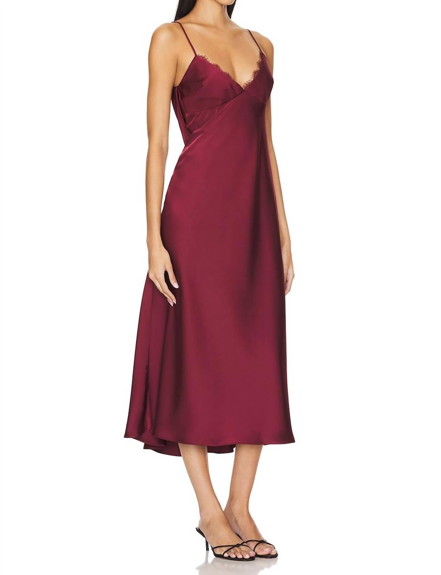 Just add slides or mules and you are good to go. Elevate your dinner party look with the Jessica Dress by Katie May, an elegant choice in rich Bordeaux. This minimalist slip dress features delicate spaghetti straps and a flattering V-neckline, crafted from medium weight satin with a lace trim finish. Composed of 100% Polyester and 100% Nylon, and fully lined for comfort, this dress is made in the USA. Closure: Concealed side zipper. Care: Dry clean only. With a 50-inch length, it's perfect for your next spring gathering or Valentine's Day celebration.