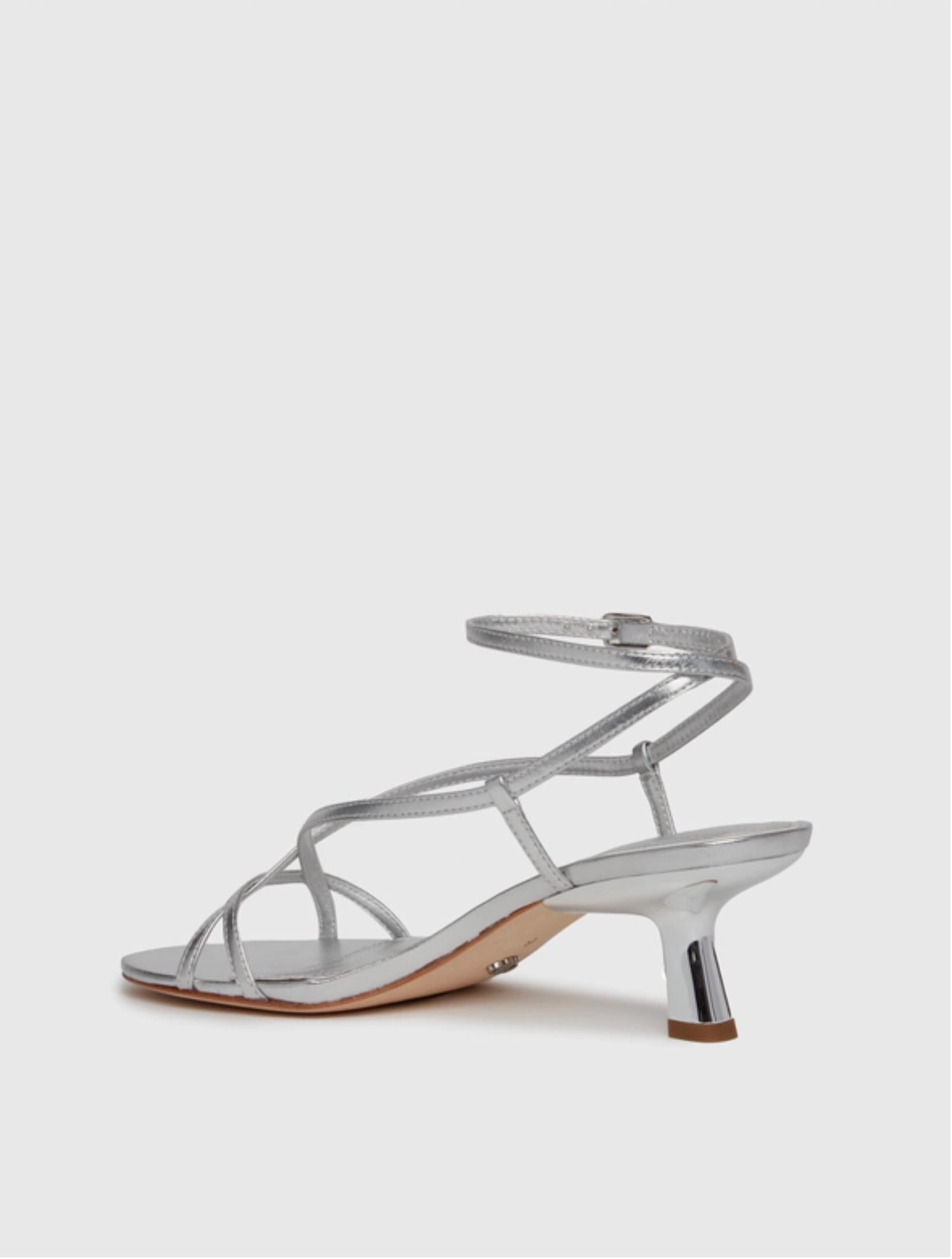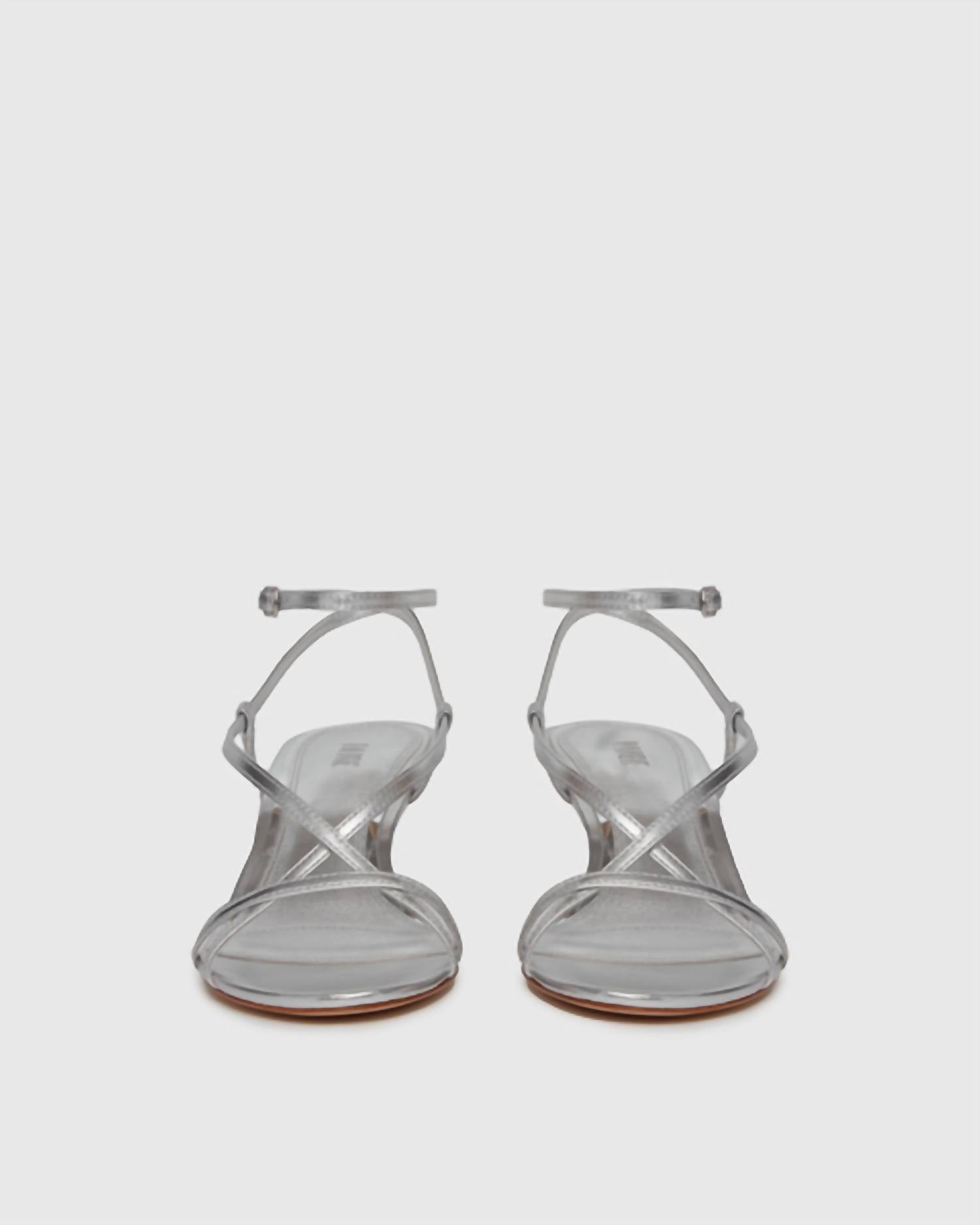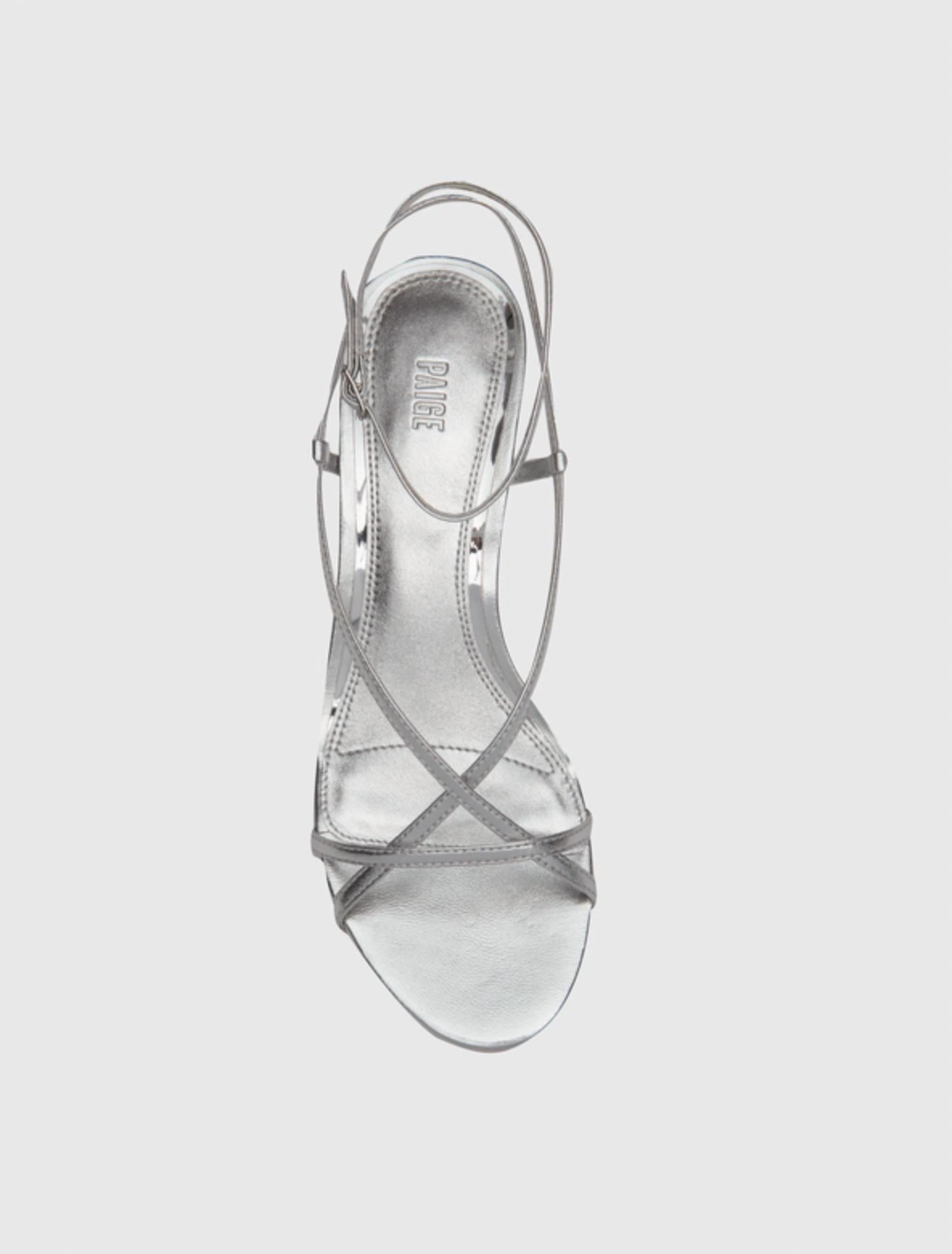 Flowy dresses, cropped pants, and even jumpsuits... this sandal works with them all! Step into sophistication with the Women's Emeline Heel Sandals by Paige, crafted from luxe metallic silver leather for a city-chic look. Featuring delicate thin straps and an ankle strap with a silver metal buckle closure, these sandals boast a modern touch with a rounded toe shape and a sculptural spool heel at a comfortable 55mm height. Material: 100% Leather Upper and Outsole. Origin: Imported.