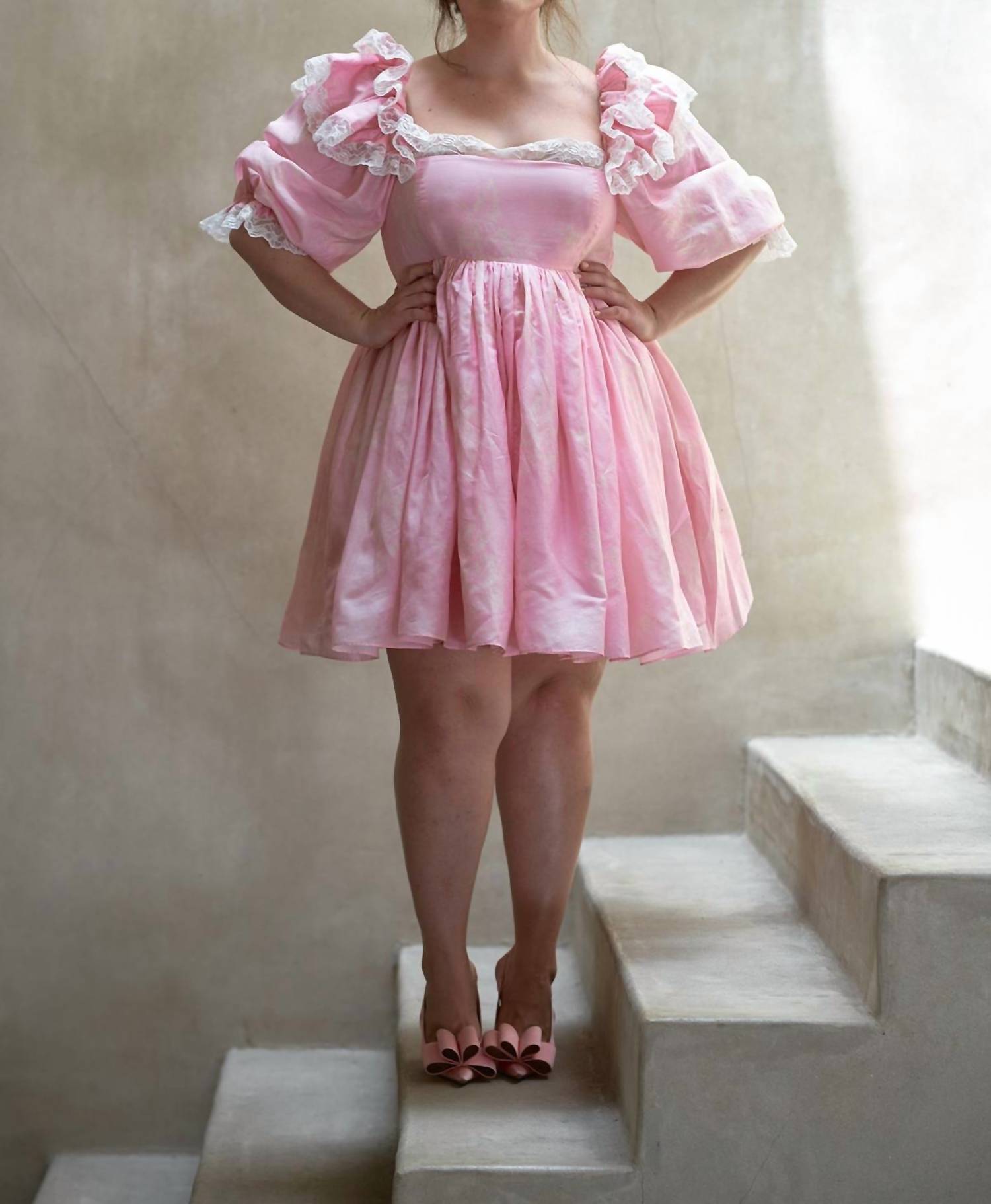 Introducing the Sugarfrill Mini Dress by Selkie, a charming addition to your wardrobe perfect for Spring engagements. This eye-catching piece features elbow-length lace-trimmed sleeves and a vintage-inspired empire waist silhouette. The solid Luau color enhances its puff skirt design, and the invisible zipper closure ensures a seamless fit. Ideal for Thanksgiving gatherings, this dress embodies timeless elegance.