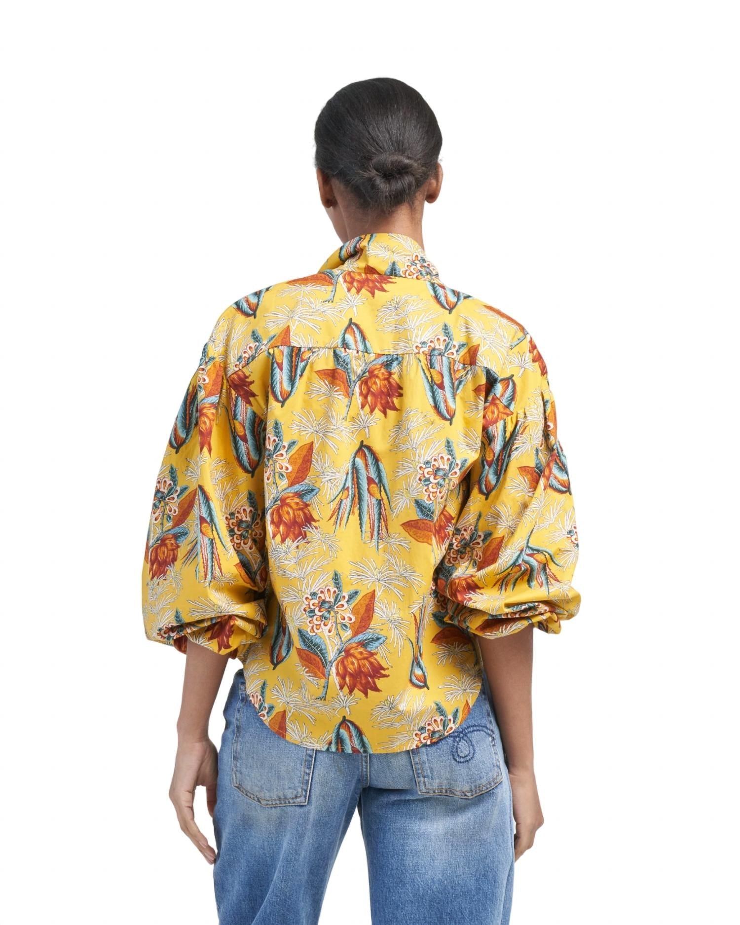 Pair this with your favorite jeans and slides for your next girls night out.This long sleeve blouse showcases a yellow floral print and is made entirely from 100% cotton. It features a necktie with a button front closure and voluminous sleeves with elasticated cuffs for a comfortable fit.