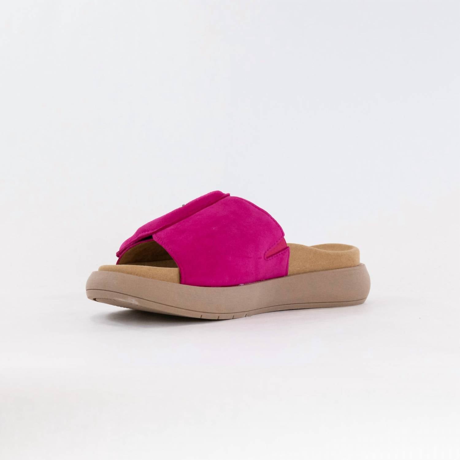 Discover the Women's Wrapped Velcro Buckle Slip On Sandal by GABOR, a chic choice for your summer adventures. Crafted from elegant pink suede, these sandals feature a minimalist design perfect for a vacation-ready look, complete with a flat heel and peep toe shape for all-day comfort. The sandals have a 10mm heel for subtle elevation and the best fitting to ensure every step you take feels luxurious. Ideal for those seeking a blend of style and practicality, these sandals are ready to complement any sunny wardrobe.