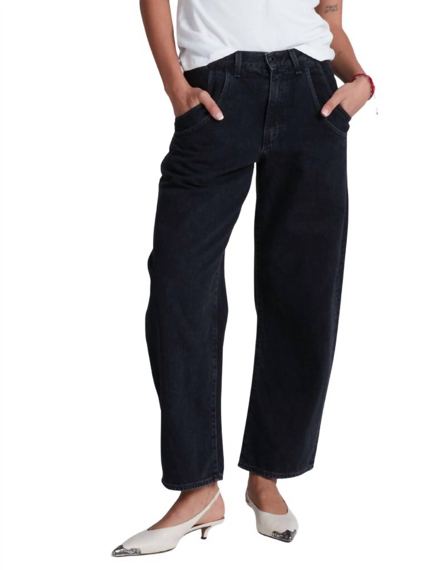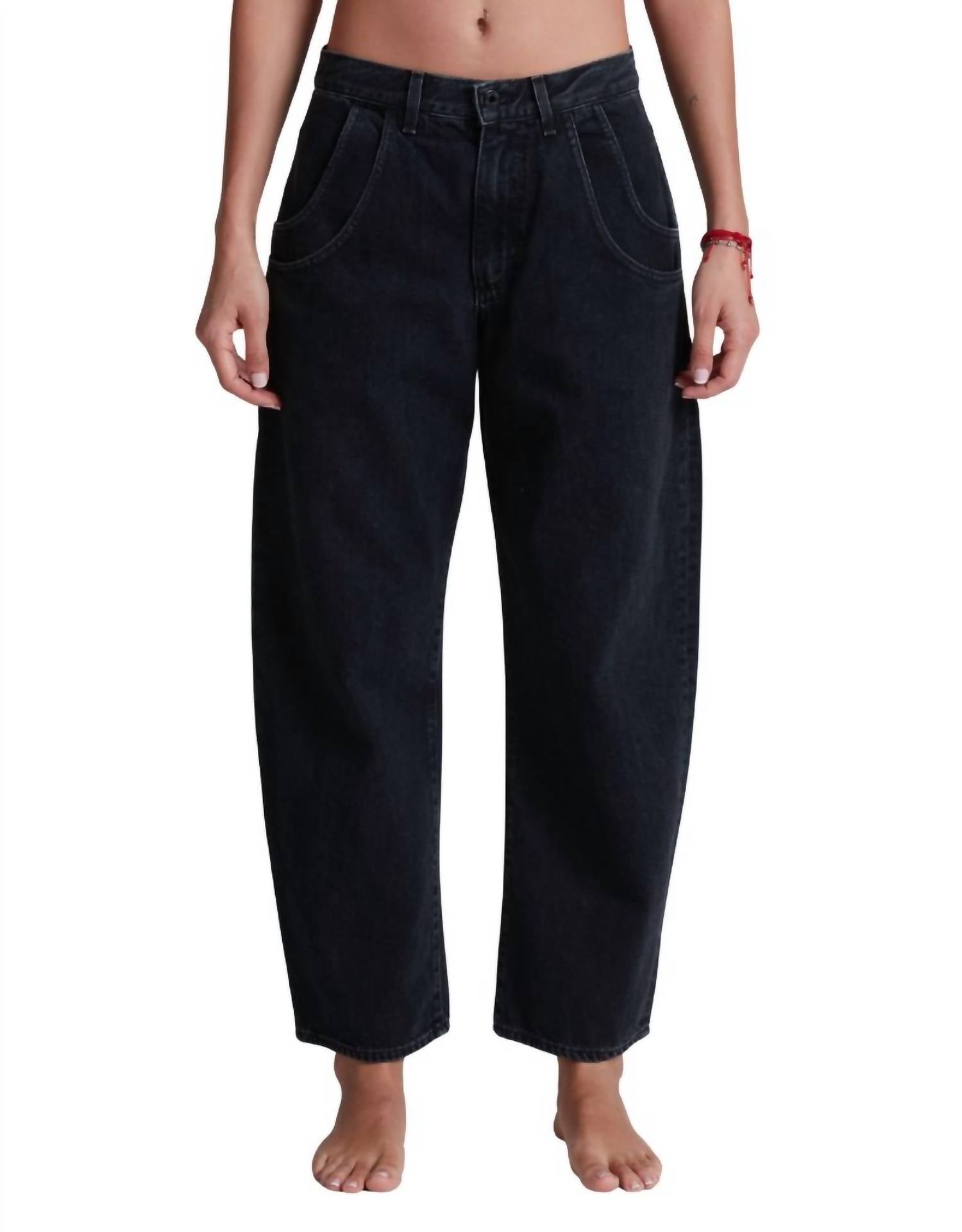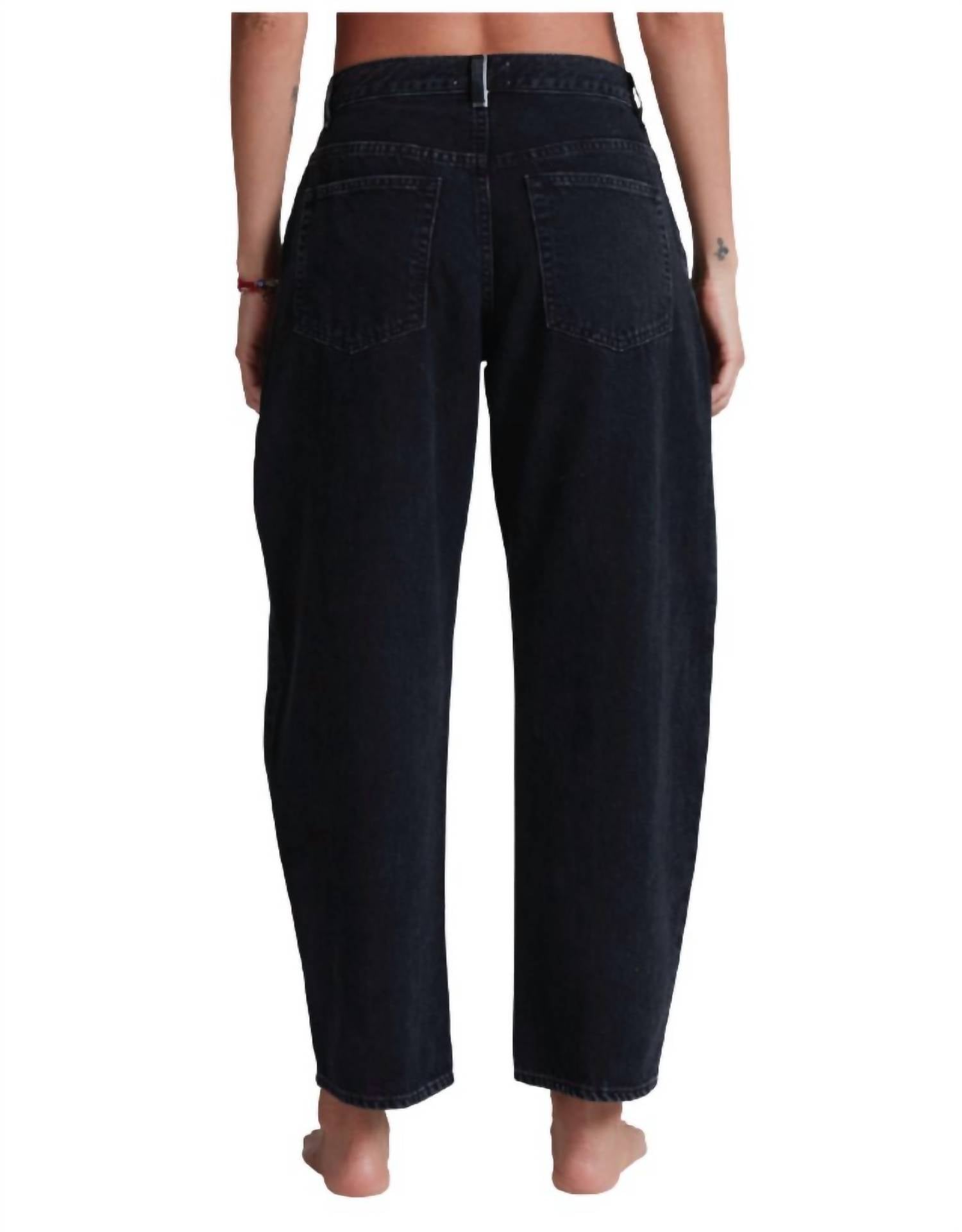 Introducing the Lenox Straight-leg Jean by ASKK NY, a relaxed-fit denim designed for a blend of vintage charm and modern versatility. Crafted in Double Stone, these jeans are made from 100% cotton, specifically 10 oz soft Japanese denim, and hail from Los Angeles. They feature a mid-rise with an 11" rise and a 28" inseam, cropped above the ankle with a subtle taper for a laid-back silhouette. Button closure. Machine wash cold separately, do not tumble dry. Model is 5'9" and wearing size 25.