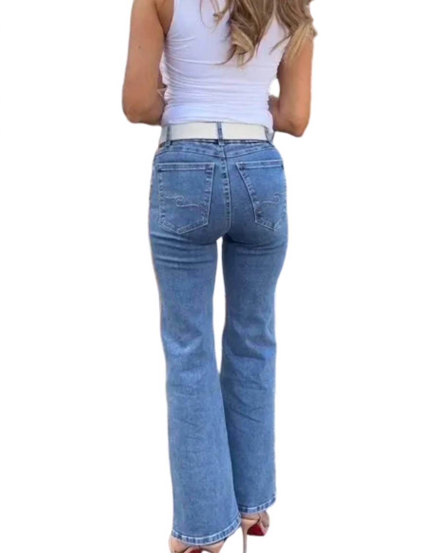 Introducing the BEVY FLOG Amy High Rise Flare Leg Jeans in denim, perfect for enhancing your collection with a touch of 90s fashion. These women's jeans feature a high-rise waist, flared leg design, and regular fit, complemented by functional pockets and belt loops for practicality. Crafted from 98% cotton and 2% lycra, the medium-wash denim ensures comfort with a zipper fly and single button closure. Dimensions include a 10.5" rise and 29" inseam, with care instructions for machine washing to maintain their timeless appeal.