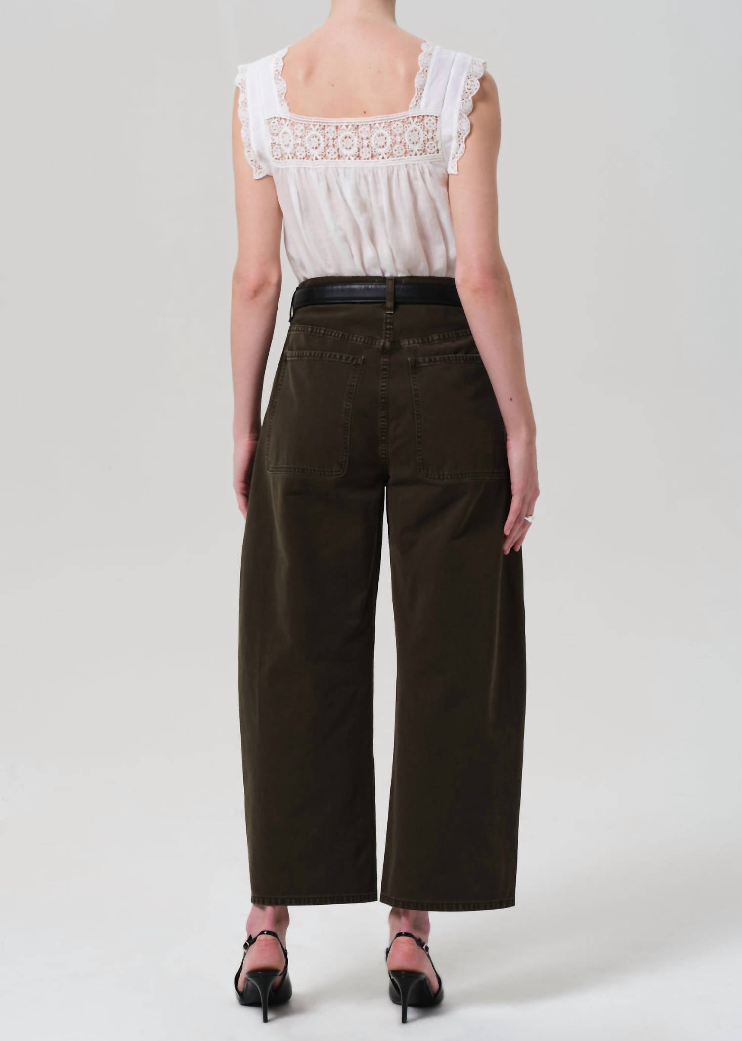 Meet the Ayla Cargo Crop Jean by Citizens of Humanity in a chic dark olive shade, perfect for a minimalist spring look. Crafted from 100% regenerative cotton, this high-rise jean features a relaxed fit and wide leg style, complete with essential front utility pockets. With a rise of 12 inches and an inseam of 26.5 inches, it closes with a convenient zip fly and is made in Turkey. Care for these jeans is effortless—simply machine wash cold inside out with like colors and tumble dry low. Model is 5'10" and is wearing a size 27.