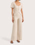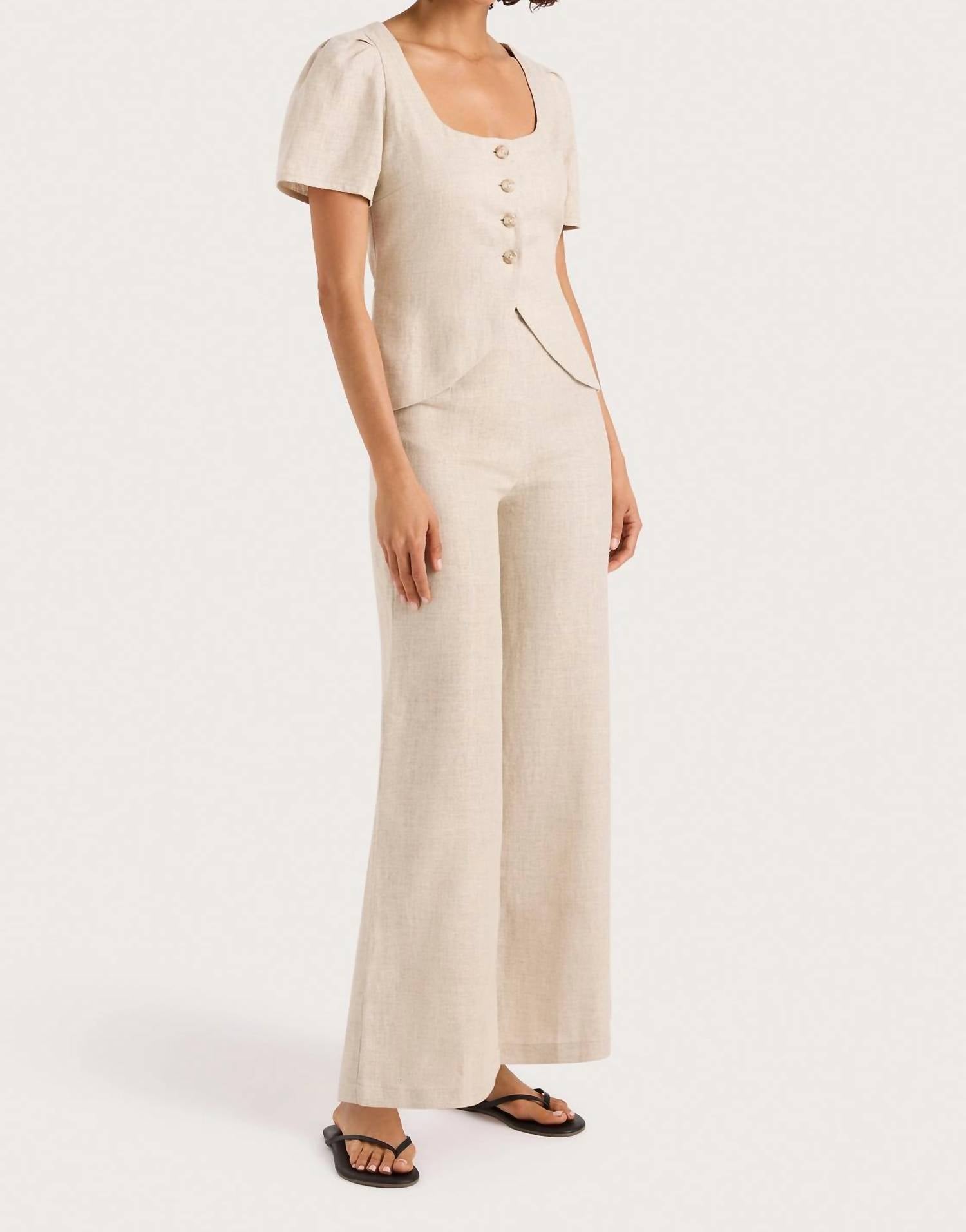 Introducing the Jean High Waist Pant from FAITHFULL THE BRAND, a timeless classic crafted from 100% European Flax linen. These natural-toned, wide-leg pants feature a high-rise waist and an invisible zip closure at the center back, delivering a flattering and seamless fit. Their regular fit and flared hem make them a stylish addition to any capsule spring wardrobe, perfect for vacation or workwear. For best care, hand wash and line dry are recommended.