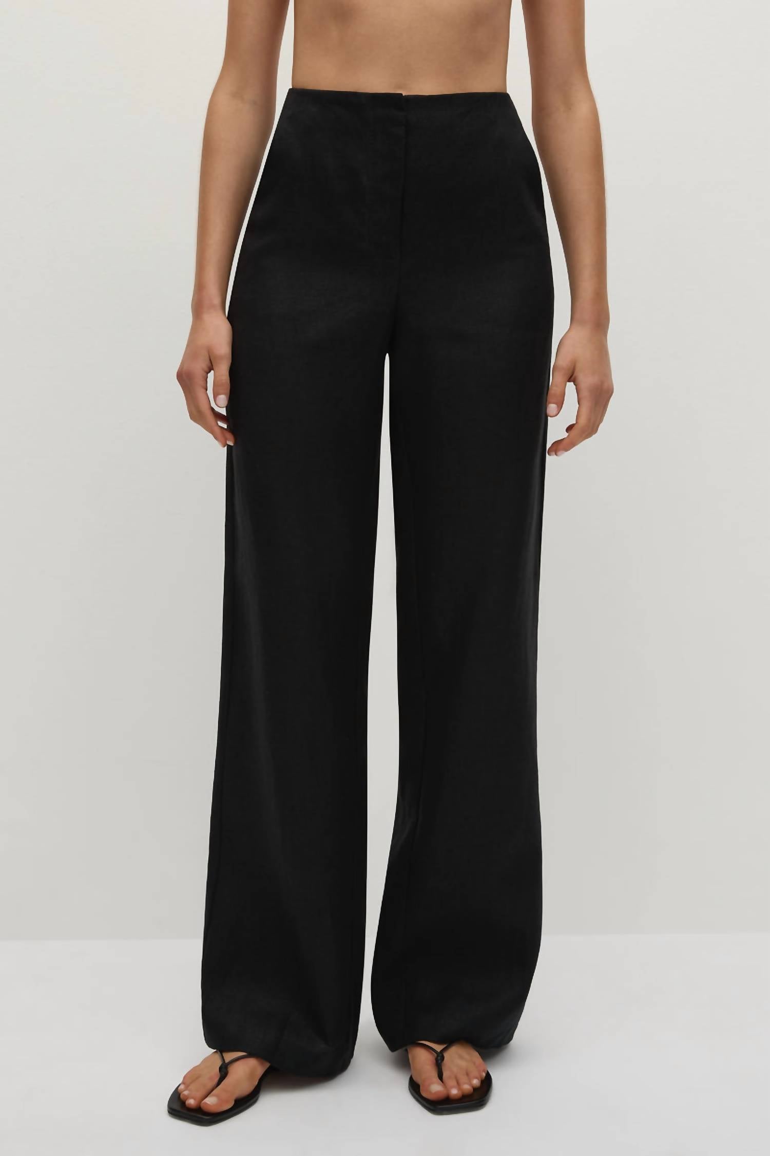 Introducing the Sanne Straight Leg Pants by FAITHFULL THE BRAND, crafted from 100% European Flax® linen in sophisticated black. These high-rise pants feature a front zip closure and practical side pockets, offering a regular fit through the waist that transitions into a classic straight leg. Made in the minimalist style, they're perfect for holiday parties and spring occasions. Care instructions: Hand wash and lay flat to dry.