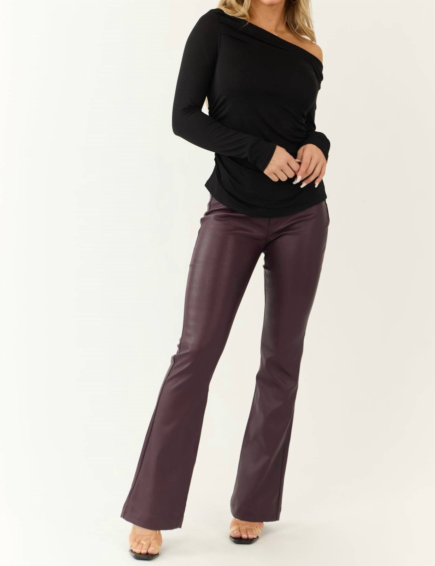 Slightly flared pants are all the rage right now and these are no exception. Pair these with your favorite tee for a more casual look, or with your favorite button-up blouse for an evening out. Introducing the Yoko Faux Leather Mid Rise Bootcut Pants by KanCan, crafted for a chic and fashionable look. These burgundy bootcut pants in solid faux leather feature a 9" rise and a 33" inseam, forming a flattering silhouette. Closure: Button with zip fly; they also boast functional back pockets and non-functional front pockets for style without compromising comfort. Care: Dry clean only. 100% Polyester.