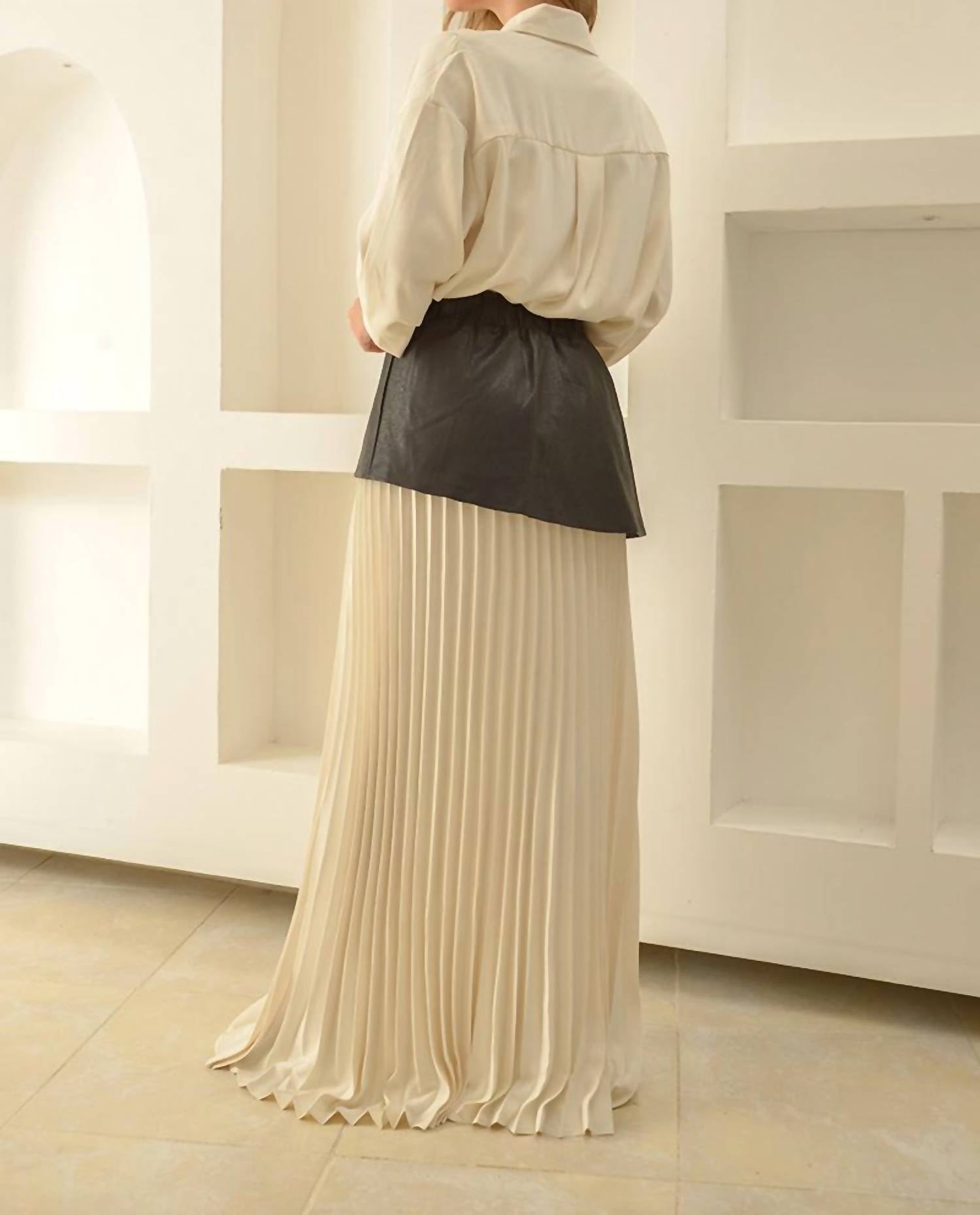 Introducing the Camelia High Fashion Set by Steffany Milano, a loungewear ensemble that captures quiet luxury and urban elegance. This beige set features a collar neckline and long sleeves, making it ideal for a stylish dinner party or New Year's Eve celebration. Crafted with a composition of 60% Polyester, 30% Rayon, and 10% PU Faux Leather, it includes a pleated maxi skirt and an oversized silky blouse, topped off with a bold faux leather belt. Designed for women who embrace a solid pattern and architecturally inspired style, this outfit effortlessly embodies a shift dress silhouette, perfect for the fall season.