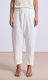 Introducing the Sauna Cocoon Shaped Leg Pant by APIECE APART, a wardrobe must-have in a versatile cream color. These pull-on pants boast a relaxed fit with an elastic waistband and a cocoon-shaped leg, perfect for pairing with tanks or lightweight knits. Crafted from 60% organic cotton and 40% linen, they feature a 25.5" inseam and slash pockets for added convenience. Care instructions recommend dry cleaning or a gentle machine wash with like colors, laying flat to dry, and using a low iron as needed. Model is 5'10" and wearing a size small.