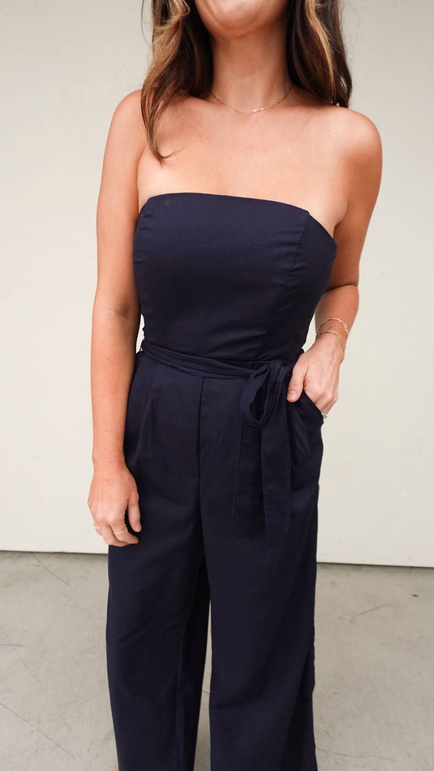 Discover the DRESS FORUM Strapless Jumpsuit, an elegant navy blue piece perfect for weddings, parties, or summer events. This navy linen-blend jumpsuit features a tailored bodice with a strapless neckline, structured boning, and a silicone liner for secure support. With a wide-leg silhouette, it elongates the legs beautifully, complemented by a smocked back and a removable tie belt. Closure: Hidden back zipper ensures a smooth fit. Fits true to size, with Elizabeth at 5'7" and Lauren at 5'2" both wearing a size small.