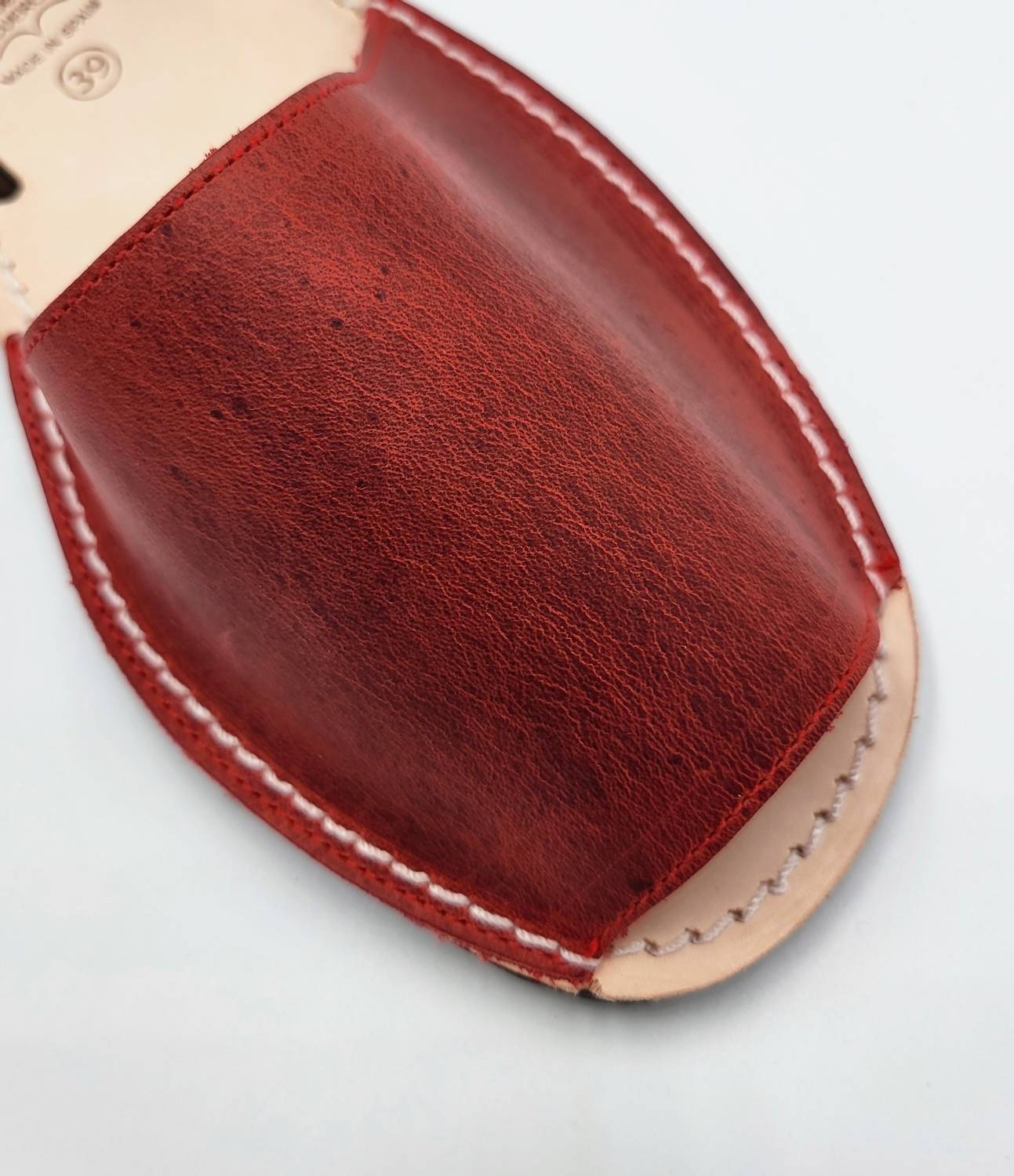 Classicly cute and all-day-wearable. We love this sandal. Presenting the Men's Avarcas Flat Sandals by Numa by Spanians, a perfect blend of traditional craftsmanship and 90s fashion in a striking red shade. Made from aged leather, these sandals feature a durable and non-slip rubber sole, ideal for vacation wear. Handmade in Spain, these flat sandals are designed with a round toe and a flat heel under 1", ensuring comfort and style for casual and special summer occasions. Embrace Menorcan authenticity with every step in these remarkable avarcas.