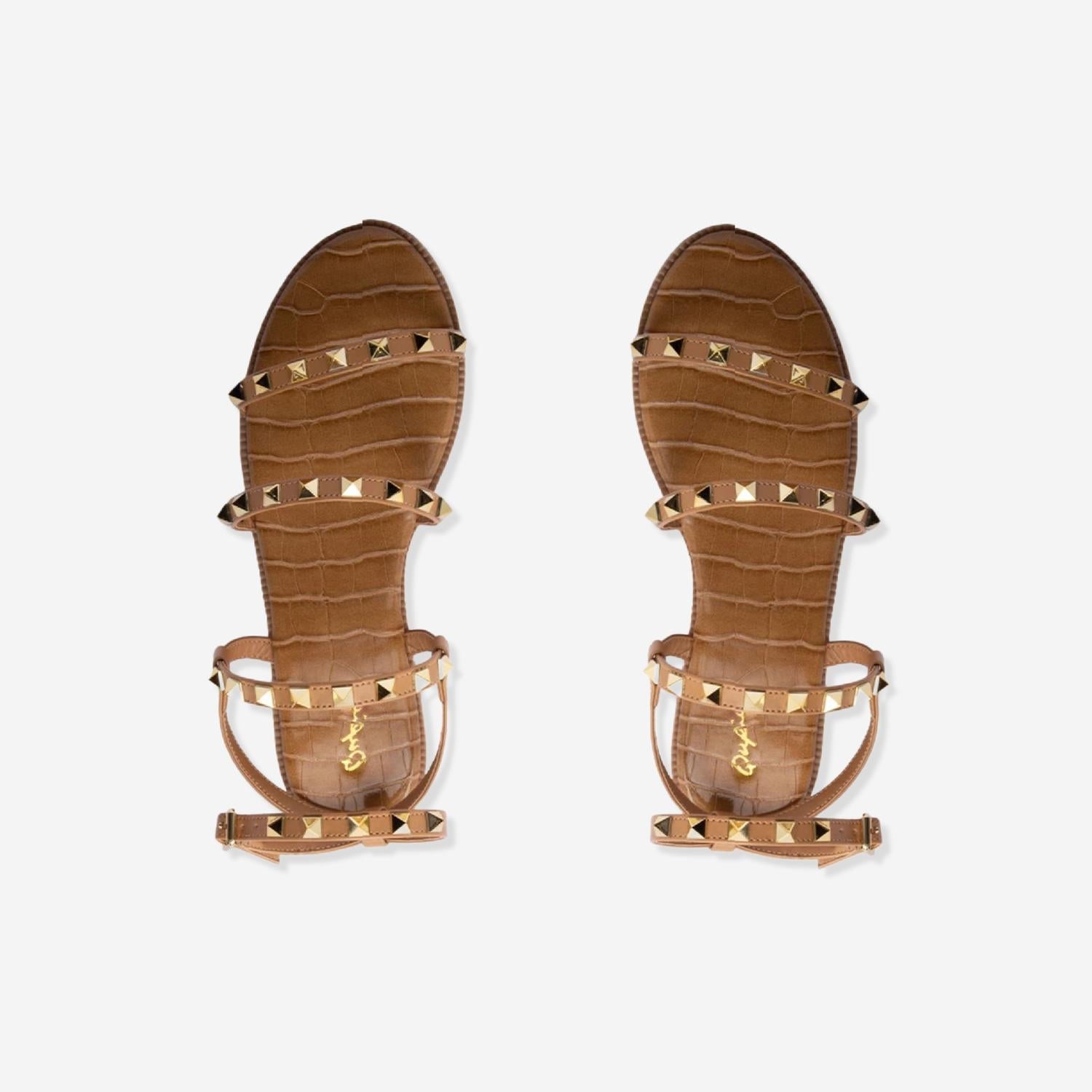 Flowy dresses, cropped pants, and even jumpsuits... this sandal works with them all! Experience the edgy elegance of Qupid's Women's Studded Strappy Sandals, designed in a striking toffee hue. These sandals showcase bold studded detailing and a sleek strappy design crafted from soft faux leather, providing a stylish and cruelty-free option. The open toe shape and durable rubber sole offer all-day comfort, making them an ideal choice for warm summer days. Effortlessly slip into these sandals for versatile pairing with shorts, sundresses, or jeans.