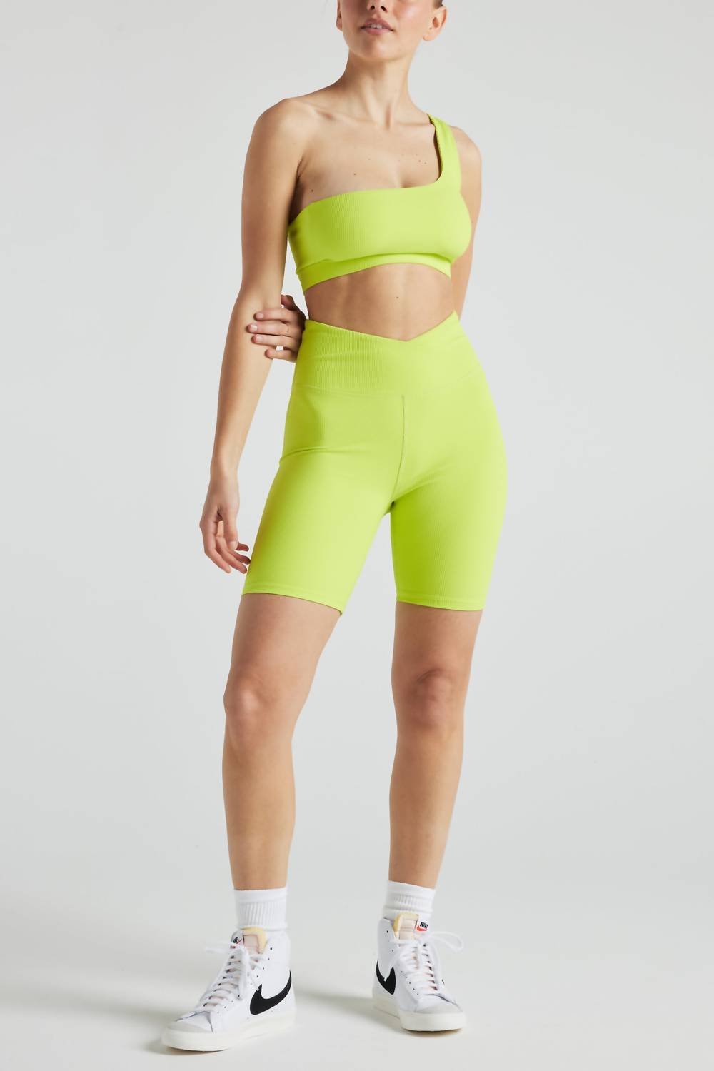Meet the Rib Biker Shorts by Electric Yoga, a must-have for active fashionistas. These lime punch shorts are made from a nylon blend, offering a universally flattering length and a high-waisted, waist-snatching crossover band. Crafted from an ultra-versatile rib fabric, they provide light to medium support, are moisture-wicking, quick-drying, and lined for extra coverage. Easy to care for, these machine-washable shorts should be laid flat to dry. The model is 5’8” with 32" bust, 24.5” waist, and 37” hips, wearing a size S.