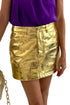 Embrace the trend of quiet luxury this fall with the Millie Metallic Mini Skirt by AMYLYNN, an ideal choice for game days and beyond. This high-waisted skirt comes in vibrant cobalt blue, gold, and purple, crafted from a polyester/PU blend faux leather metallic fabric. It features a convenient front zip closure and front pockets for added functionality. Model wears a size small, embodying the season's must-have style.