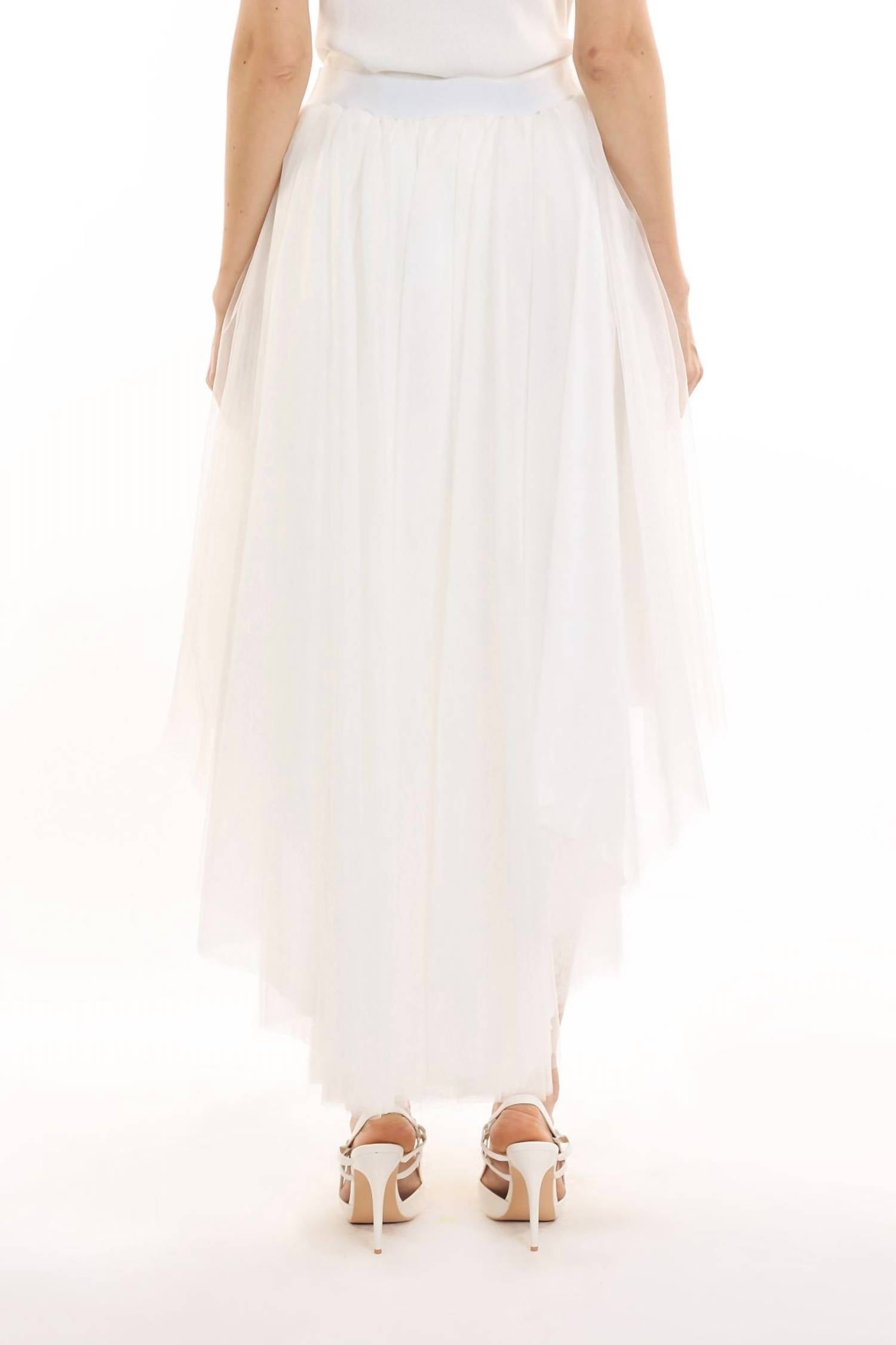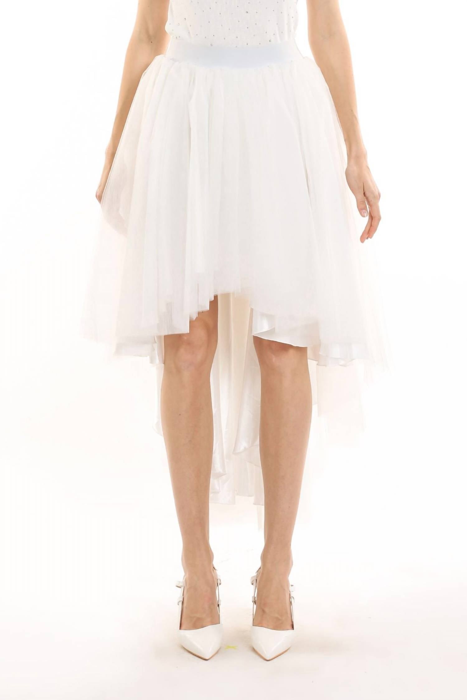 Feminine and stylish, this assymmetical skirt checks all of the boxes. Introducing the Tulle High/Low Pullover Skirt by BEULAHSTYLE, a statement piece in versatile white. This asymmetrical skirt, crafted from 1009% textured polyester, features a flared design that exudes elegance and sophistication. Closure: Pull on. Care: Hand wash and line dry. Perfect for adding a touch of 90s fashion to your spring wardrobe, ideal for holiday parties and special occasions.