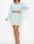 Elevate your vacation wardrobe with the Kiki Knit Crocheted Mesh Top and Skirt Set by Haute Monde, offered in a refreshing mint green. The top showcases long cuffed sleeves, with a V-neckline, drape shoulders, and a chic cropped length enhanced by side ruching and drawstring details. Paired with the mid-rise mini skirt, which features an elasticized waistband, this set embodies a textured, minimalist look perfect for spring. Designed in a whimsical style, the pull-on closure ensures ease while exuding effortless charm.