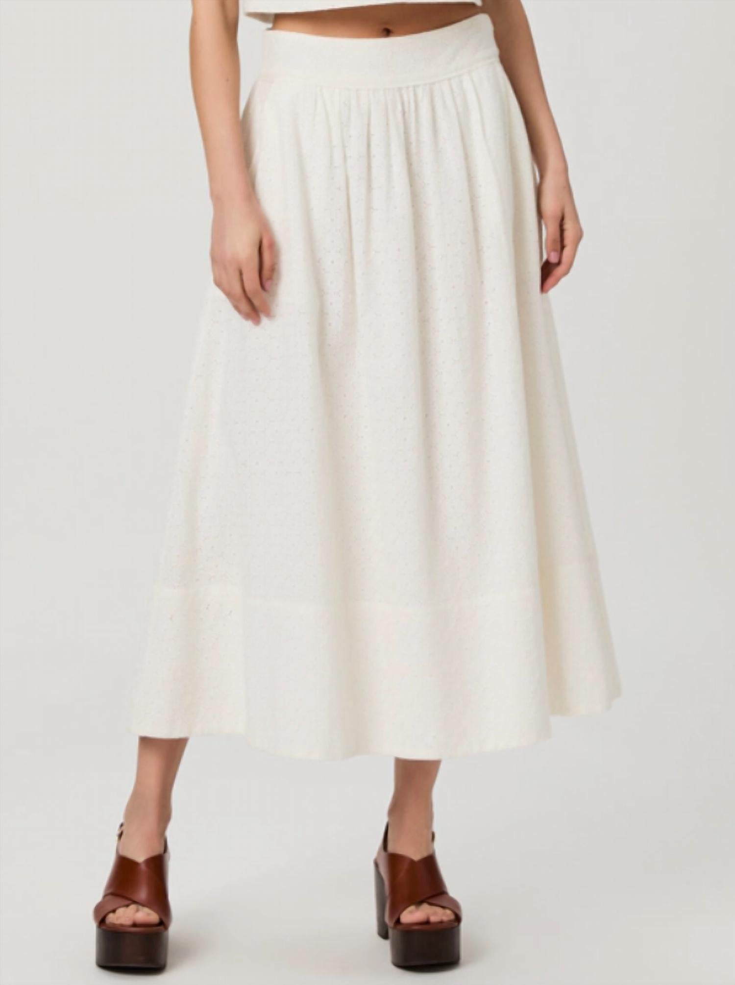 The midi length skirt is here to stay and we especially love this style. Elevate your vacation wardrobe with the Paige Ojai Eyelet Midi Skirt, an elegant piece in crisp white perfect for a minimalist spring style. This women's skirt showcases a beautiful floral eyelet texture in 100% cotton, complete with convenient slash pockets and a comfortable pull-on closure. Designed for easy pairing with the coordinating Aelita Top, it's a stylish choice for chic warm-weather occasions.