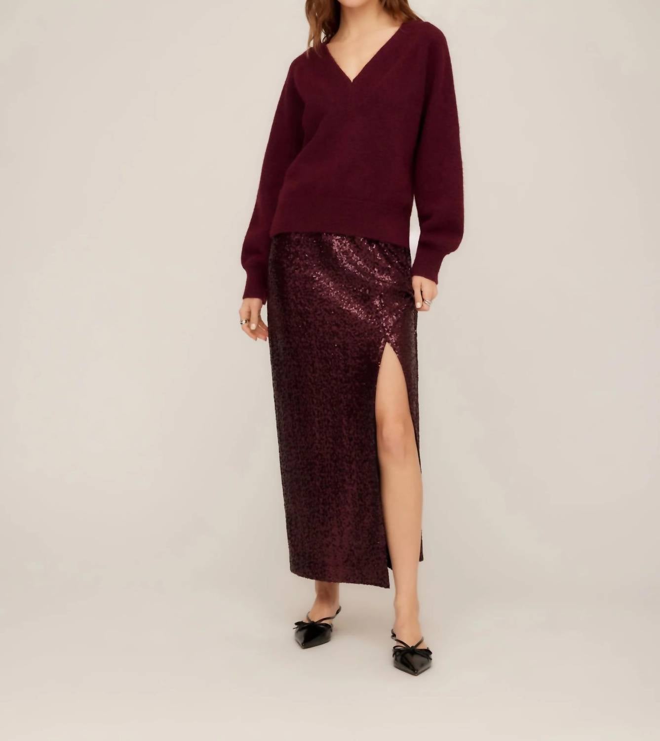 The Heather V Neck Sweater by Fifteen Twenty in stunning wine is a perfect minimalist addition for your dinner party outfit this Thanksgiving. Featuring long raglan sleeves and a flattering V-neckline, this solid staple offers a relaxed fit with a slight drape. Crafted from a lightweight blend of 56% recycled polyester, 37% polyester, 5% wool, and 2% spandex with ribbed detailing, it provides an elevated cozy feel. Detail: Length measures 18 3/4 inches for size S. Care: Hand wash cold, lay flat to dry or dry clean.