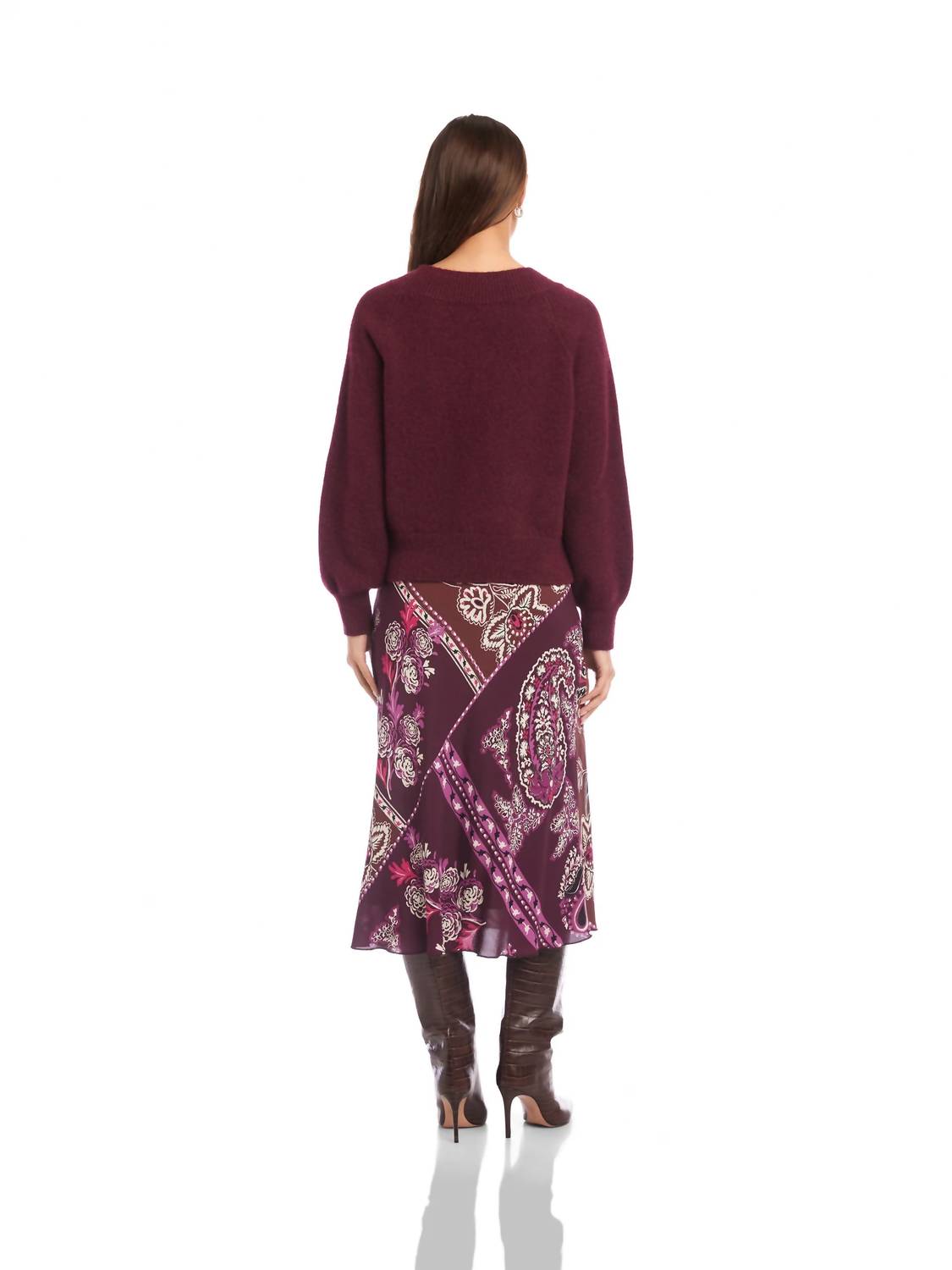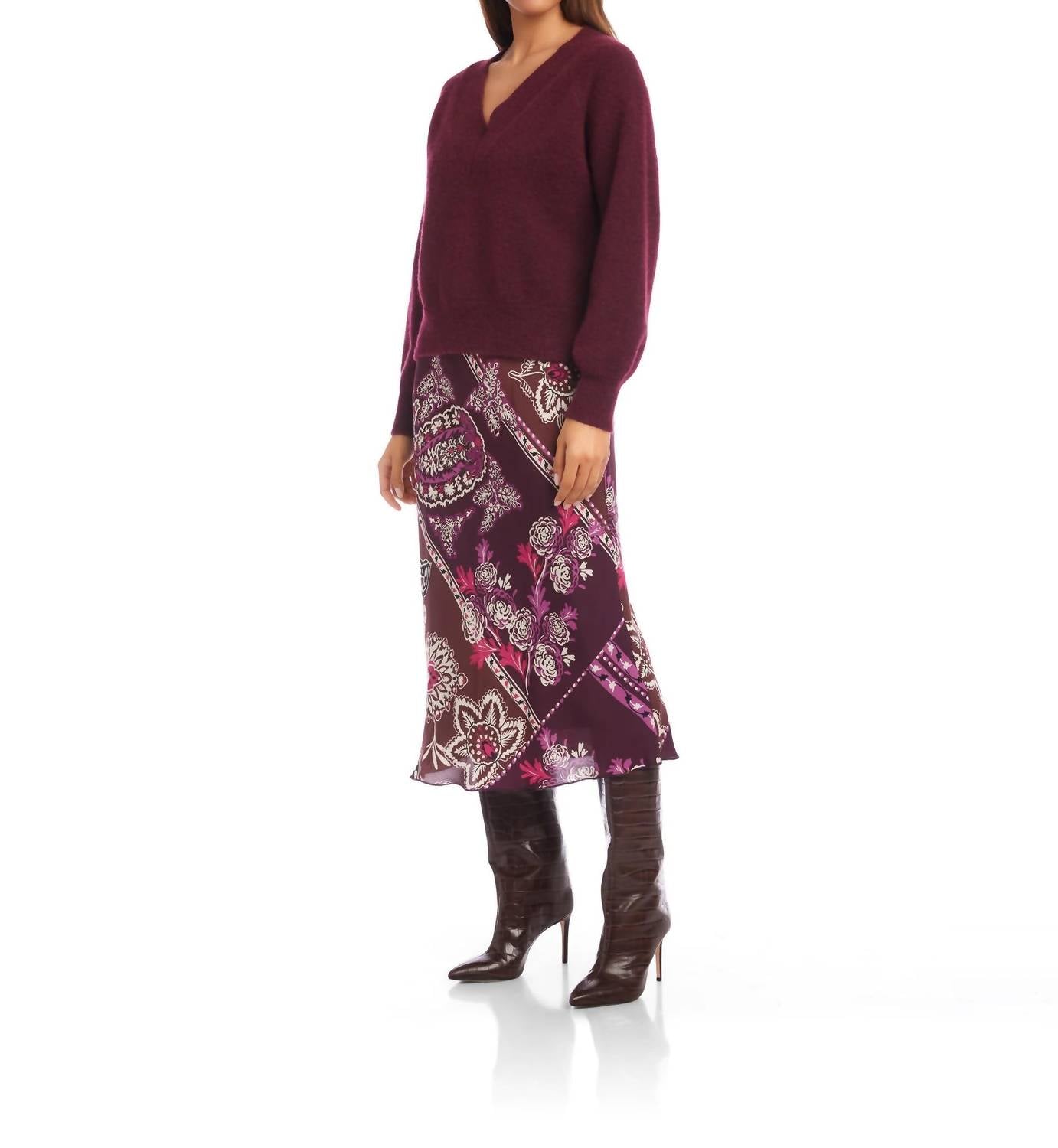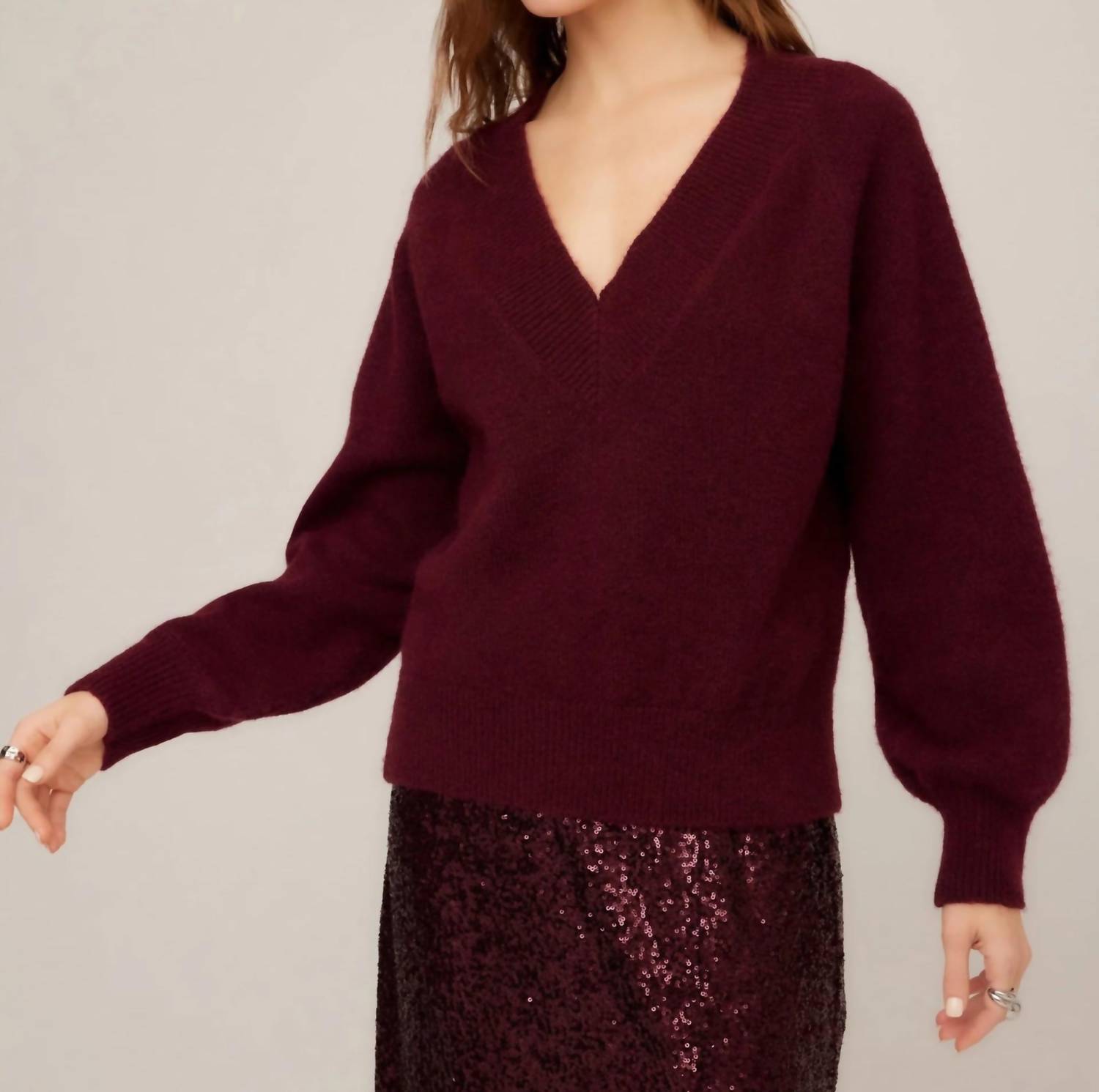 You'll be reaching for this comfy and classic v-neck sweater all season long. The Heather V Neck Sweater by Fifteen Twenty in stunning wine is a perfect minimalist addition for your dinner party outfit this Thanksgiving. Featuring long raglan sleeves and a flattering V-neckline, this solid staple offers a relaxed fit with a slight drape. Crafted from a lightweight blend of 56% recycled polyester, 37% polyester, 5% wool, and 2% spandex with ribbed detailing, it provides an elevated cozy feel. Detail: Length measures 18 3/4 inches for size S. Care: Hand wash cold, lay flat to dry or dry clean.